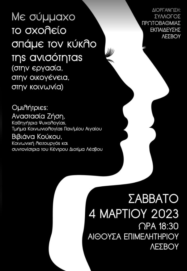 Ο Σύλλογος Πρωτοβάθμιας Εκπαίδευσης Λέσβου διοργανώνει το Σάββατο 4 Μαρτίου 2023, στις 18:30, στο Επιμελητήριο Λέσβου ομιλία με τίτλο: «Με σύμμαχο το σχολείο σπάμε τον κύκλο της ανισότητας (στην εργασία, στην οικογένεια, στην κοινωνία)». Ομιλήτριες στην εκδήλωση είναι η Αναστασία Ζήση Ι Καθηγήτρια Ψυχολογίας του τμήματος Κοινωνιολογίας του Πανεπιστημίου Αιγαίου και η Βιβιάνα Κούκου Ι Κοινωνική λειτουργός και συντονίστρια του Κέντρου Διοτίμα Λέσβου.