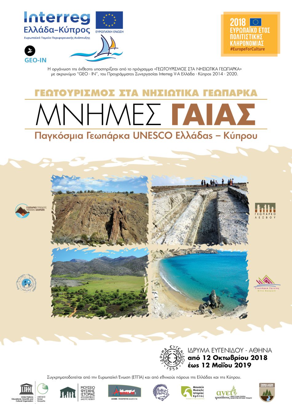 Η έκθεση θα παρουσιαστεί στο Ίδρυμα Ευγενίδου στην Αθήνα από 12 Οκτωβρίου 2018 έως 12 Μαΐου 2019. Η έκθεση παρουσιάζει τα μοναδικά γεωλογικά και φυσικά μνημεία που φιλοξενούν τα Γεωπάρκα της Ελλάδας και της Κύπρου, εντυπωσιακά τοπία, απολιθωμένα δάση, φαράγγια, καταρράκτες, σπήλαια, ακτές, κοιλάδες, απολιθώματα σπονδυλωτών και μας προσκαλεί να ανακαλύψουμε την ιστορία της Γης μας αλλά και τη ιστορία της ανατολικής Μεσογείου.