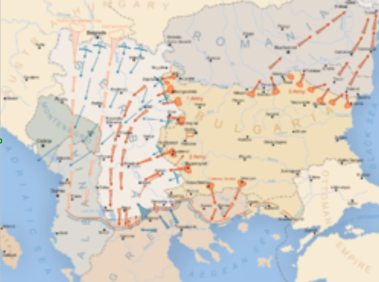Η επέκταση της Βουλγαρίας κατά τον Α΄ Παγκόσμιο Πόλεμο με την κατοχή των ελληνικών εδαφών της Ανατολικής Μακεδονίας. ( Wikipedia).