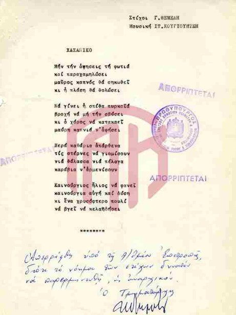 Με ειδικό Διάταγμα του Γεν. Επιτελείου Στρατού (Αντιστράτηγος Οδ. Αγγελής), αμέσως, μετά το πραξικόπημα, απαγορεύτηκε, γενικώς, η Μουσική Μ. Θεοδωράκη και όλα τα τραγούδια που είχε μελοποιήσει. Στη συνέχεια απαγορεύτηκαν τραγούδια του Χατζηδάκη-Γκάτσου-Μπιθικότση (Πάει καιρός), του Γ. Μαρκόπουλου- Μποστ- Γ. Πουλόπουλου (Χαράματα), Βας. Κουμπή-Δ. Ιατρόπουλου-Μητροπάνου (Χαμένη Πασχαλιά), Μ. Πλέσσα-Κ. Βίρβου-Νταλάρα (ο Μπάρμπα Γιώργος), Λουκιανού Κηλαηδόνη- Λ.Παπαδόπουλου- Μητσιά(ο δραγουμάνος του Βεζύρη).
