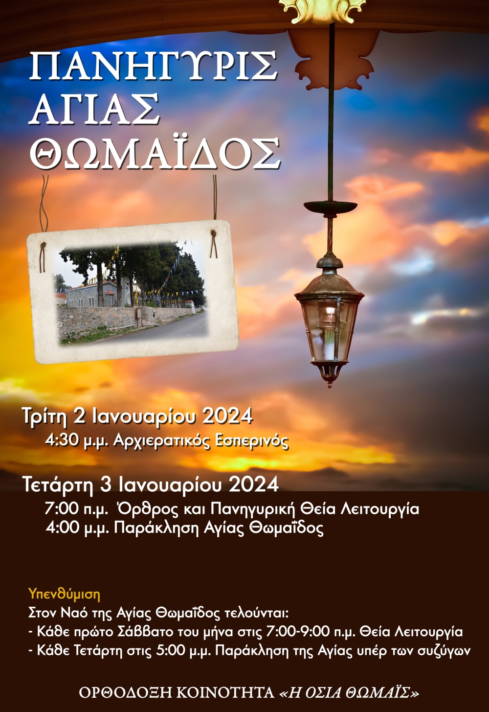 Στις 3 Ιανουαρίου 2023 πανηγυρίζει ο Ναός της Αγίας Θωμαΐδος της εκ Λέσβου, προστάτιδας της συζυγίας, που βρίσκεται επί της οδού Θεοφίλου Χατζημιχαήλ, πίσω από το Νοσοκομείο Μυτιλήνης.