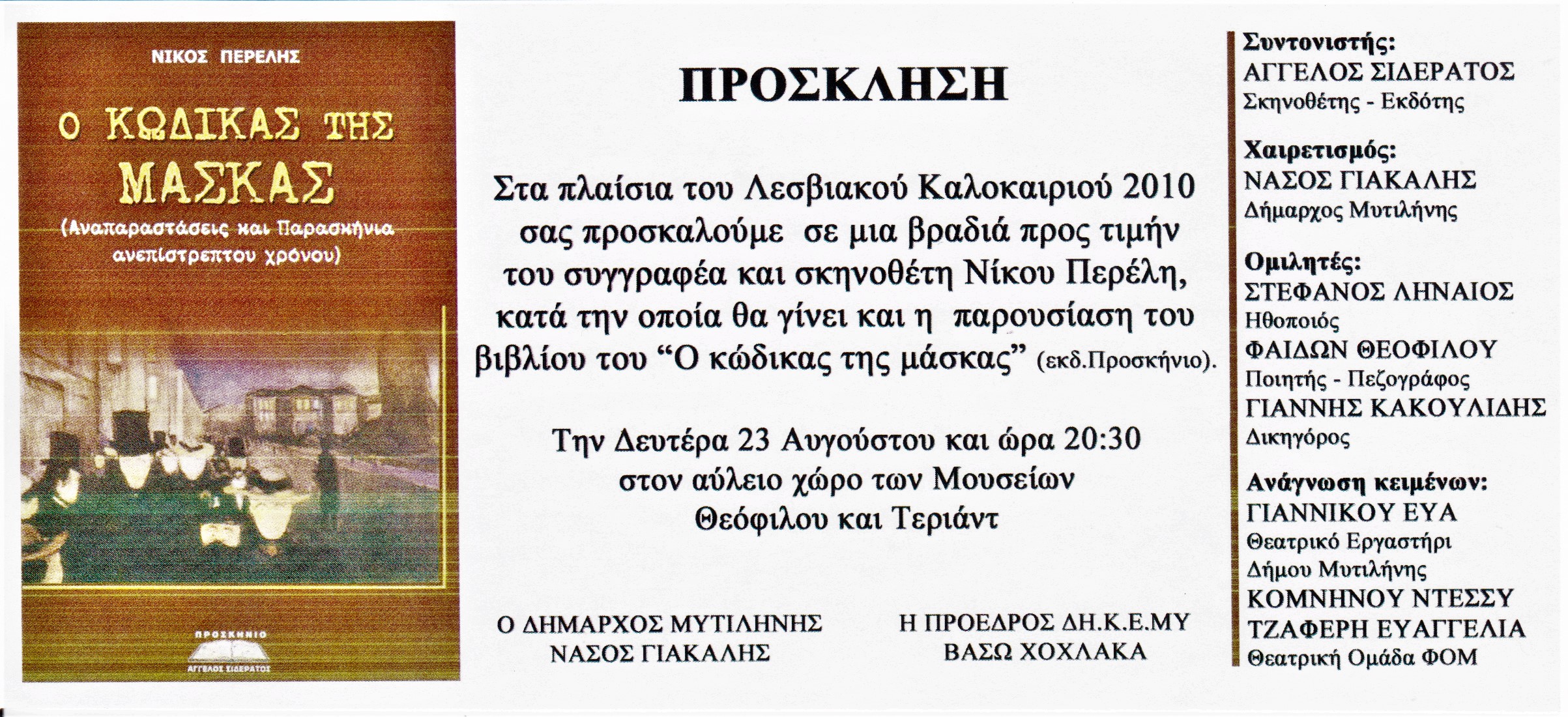 Με αφορμή την πρόσφατη κυκλοφορία από τις εκδόσεις ΑΓΓΕΛΑΚΗ του τελευταίου θεατρικού βιβλίου του λέσβιου θεατρικού συγγραφέα, σκηνοθέτη και ηθοποιού Νίκου Περέλη με τίτλο «ΟΔΥΣΣΕΑΣ, ΤΟ ΛΙΟΝΤΑΡΙ ΤΗΣ ΡΟΥΜΕΛΗΣ», αφιερωμένου στον ήρωα του Εικοσιένα Οδυσσέα Ανδρούτσο, οι Φίλοι Ιστορικής Μνήμης & Πολιτιστικής Δημιουργίας κάνουν ένα σύντομο αφιέρωμα στον ίδιο και το σημαντικό έργο του.
