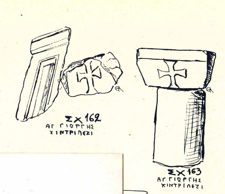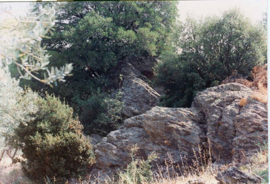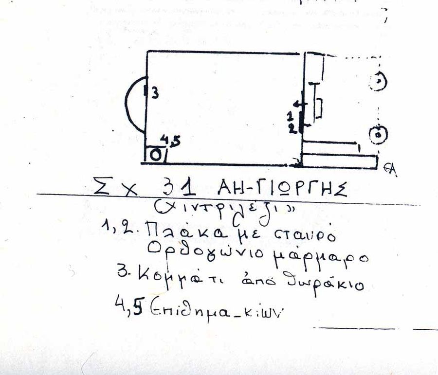 Ένας αγροτικός δρόμος έρχεται προς τα μέσα, λοξά, προς τα ΝΑ, ακολουθώντας τους πρόποδες των λόφων. Αριστερά του απλώνεται πεδινός ελαιώνας και μετά τα περιβόλια. Η κεραμική σ’ αυτήν την έκταση είναι διάσπαρτη και άφθονη, ξεκινώντας από την Κλασσική-Ελληνορωμαϊκή περίοδο και καταλήγοντας στην Υστεροβυζαντινή. Ενώ για εκατό περίπου μέτρα ο δρόμος συνοδεύει από δεξιά τον λόφο, η πεδιάδα ξαφνικά εισχωρεί βαθειά, σχηματίζοντας μια επίπεδη έκταση που περιβάλλεται ημικυκλικά από τα υψώματα, τα οποία στο νότιο σκέλος του πέταλου που σχηματίζουν φέρνουν στις κορυφές τους απότομους βράχους από καφετί σχιστόλιθο. Οι ντόπιοι τις ονομάζουν «Κορακόπετρες» (39ο 05.6996-26ο 46.9452). Αυτό το πεδινό «πέταλο» το διασχίζει στο μέσον ένα μικρό ρυάκι. Δεξιά και αριστερά του, τα κτήματα είναι γεμάτα από τα απομεινάρια του παλιού οικισμού. Τα περισσότερα βρίσκονται στο μεγάλο κτήμα, δεξιά στο δρόμο, και πυκνώνουν πολύ στο βάθος του τόξου, δίπλα στους πρόποδες του λόφου. Χοντρά τούβλα και κεραμίδια της Βυζαντινής και μεταγενέστερης εποχής, μαζί με κάτι όστρακα από πρόχειρα, άβαφα αγγεία, φαίνονται παντού, στην επιφάνεια και χωμένα στο χώμα. Τα απομεινάρια του παλαιοχριστιανικού ναού βρίσκονται λίγο πιο πάνω. Στη μέσα πλαγιά του λόφου, που περιβάλει από βόρεια την μικρή πεδιάδα, και πάνω από το τμήμα της όπου τα όστρακα και τα κεραμίδια πυκνώνουν, βρίσκεται το πολύ παλιό εκκλησάκι του Αι - Γιώργη του «πίσω». (39ο 06.2022-26ο 46.3743). Την παλαιότητα του κτίσματος φανέρωνε το 1987, η διπλή σειρά από λοξά τοποθετημένα τούβλα κάτω από τη σκεπή του, που είναι διακοσμητικό στοιχείο των νεοκλασικών κτισμάτων του 19ου αιώνα. Ένα μεγάλο κυπαρίσσι το σκιάζει και πάνω του ήταν εντοιχισμένα τα αρχιτεκτονικά μέλη ενός παλαιοχριστιανικού ναού (Σχ. 31). Έτσι πάνω από την πόρτα του βρίσκονταν ένα κομμάτι μάρμαρο με σταυρό και ένας πεσσός με το γνωστό ορθογώνιο σχέδιο της χριστιανικής διακοσμητικής. Μέσα στο ιερό, στην ΒΑ γωνιά στέκεται επάνω σε αράβδωτη κολώνα επίθημα του παλιού ναού. Τέλος στον ανατολικό εξωτερικό τοίχο, επάνω από την κόγχη του ιερού ήταν εντοιχισμένο ένα μικρό κομμάτι μάρμαρο με ανάγλυφο σχέδιο κύκλων, πιθανότατα από θωράκιο του παλαιοχριστιανικού ιερού.