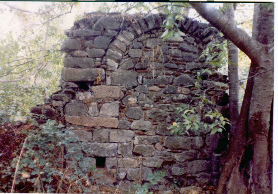 Το άλλο μνημείο βρίσκεται στις ορεινές, ασβεστολιθικές παρυφές του κάμπου, ανατολικά του Ένθρονου, και δίπλα στο ποτάμι! Τμήμα του λόφου το κατέστρεψε ο νέος δρόμος, πριν την Καρίνη! Ένα κυκλικό κτίσμα, βρίσκεται εκεί (καμίνι μάλλον) και βορειότερα του, σώζεται το θεμέλιο ιερού, με τμήμα του βορινού τοίχου, κάτω από ένα πρίνο, με θέα τον κάμπο, και επάνω από το ποτάμι, το οποίο πιο κάτω περνά από τους νερόμυλους (Μυλέλια)! Λατρεύεται σαν Άγιος Κωνσταντίνος! Το 1987 υπήρχαν μαρμάρινα αρχιτεκτονικά μέλη του ναού όπως τμήμα κιονίσκου, τμήμα κίoνος, τμήμα θωρακίου, σπασμένος αμφικιονίσκος και ωραιότατος κοσμήτης! Δυστυχώς, το 1998, τα μέλη του μνημείου δεν υπήρχαν εκεί και αυτό συνέπεσε με ανάλογα γεγονότα, αυτής της περιόδου στον κάμπο! Το ιερό ανήκει στην ευρύτερη περιοχή των «νερόμυλων» που λειτουργούσαν με τα νερά των πηγών του Ένθρονου!** Αυτή η περιοχή, που περιγράφηκε στα «Μυλέλια», ίσως να φιλοξενούσε κάποια άγνωστη κώμη!
