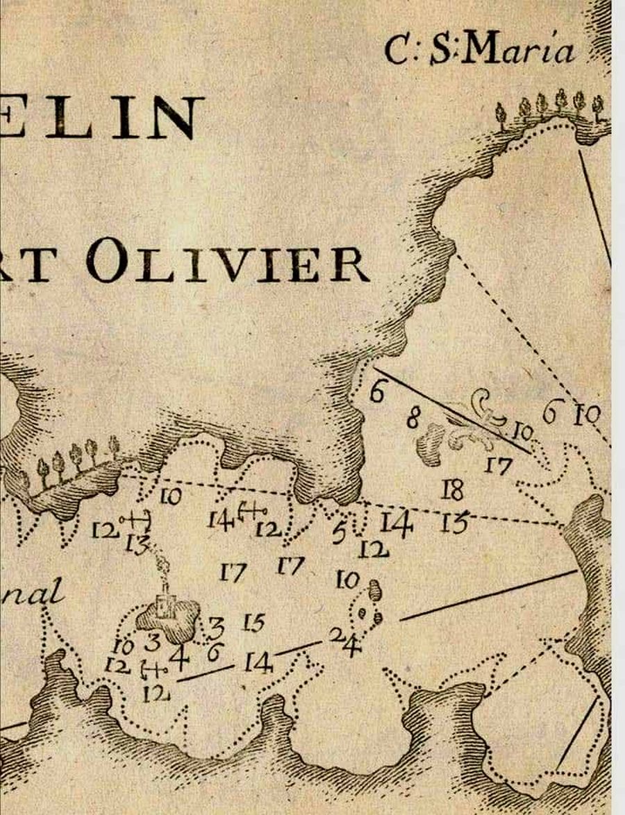 Εδώ φαίνονται και τα μικρά βάθη προς την νότια πλευρά της νησίδας. Και στους δύο χάρτες δεν φαίνεται καν ο Άγιος Ισίδωρος.