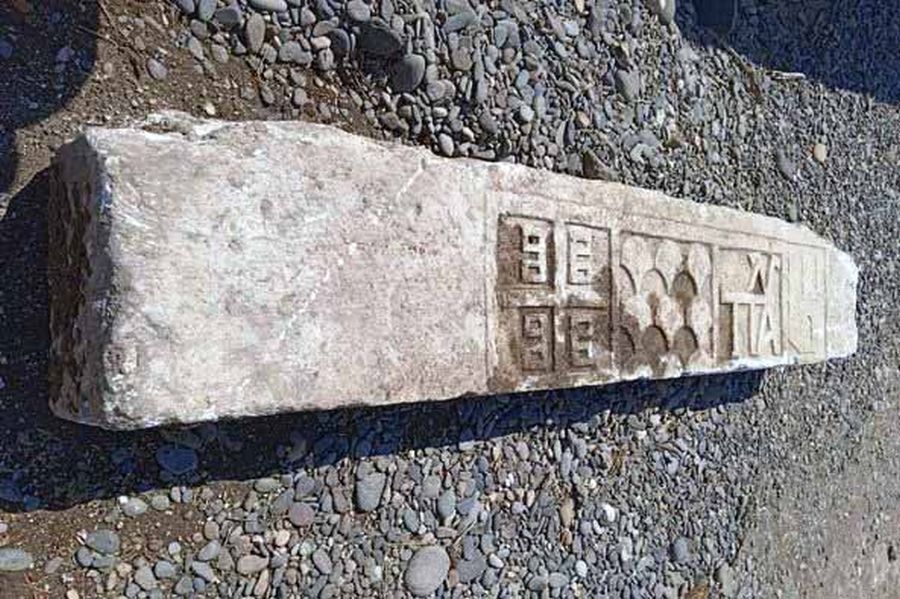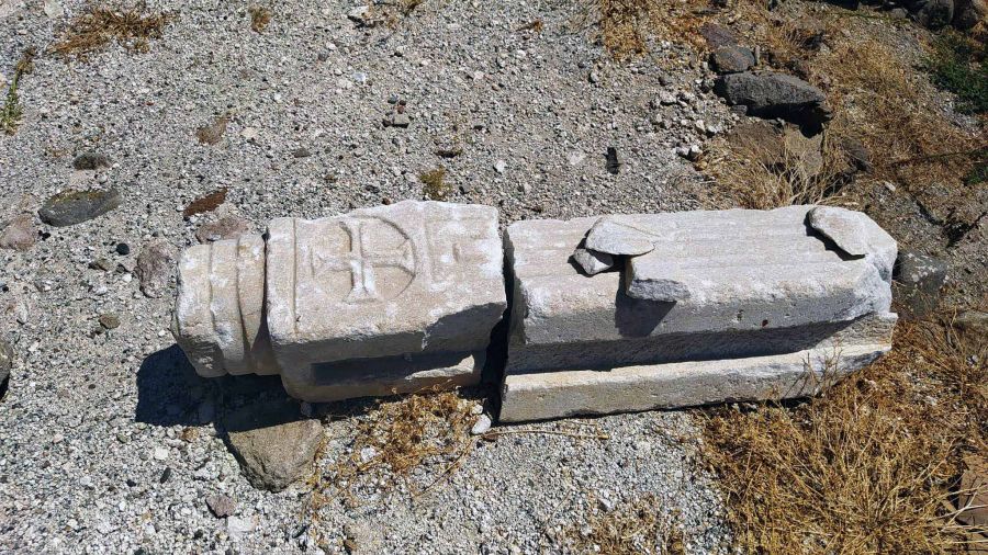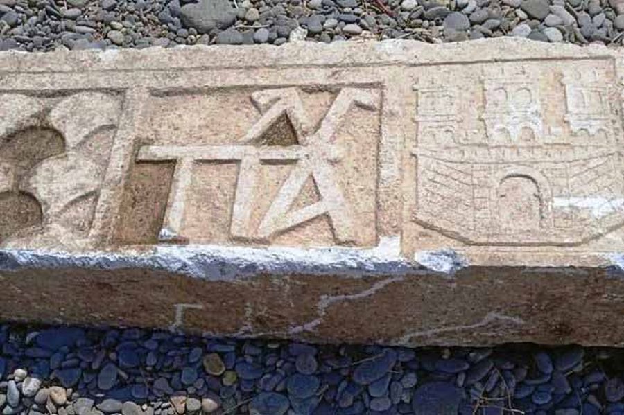 Αναφέρθηκε η ανεύρεση Θυρεού σε Μαρμάρινη πλάκα. Πρόκειται για ένα μαρμάρινο, ορθογώνιο μέλος, 3,5 μ, το οποίο φέρει μετά από άγραφο τμήμα αρχικά το Βυζαντινό 4Β, μετά το Γενοβέζικο έμβλημα των Φολίδων, το μονόγραμμα των Παλαιολόγων και μετά την απεικόνιση Κάστρου με τρεις πύργους, μάλλον το οικόσημο της μεγάλης οικογένειας Giustiniani της Χίου. Κατά πληροφορίες βρέθηκε στην βάση της Βυζαντινής πύλης. Αυτή όμως αφορά την μεταγενέστερη, Γατελούζικη φάση του κάστρου (1355-1462).