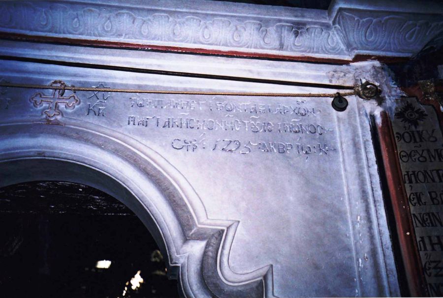 Εδώ έχουμε τον ναό του 1795, οπότε έγινε η τελευταία ανακαίνιση του παλαιότερου. Αυτή η ανακαίνιση έγινε με άδεια της Πύλης και επίβλεψη του ιεροδικαστή Καλλονής1.Αυτή η τελευταία ανακαίνιση, του 1795, αναγράφεται εσωτερικά, σε μαρμάρινη επιγραφή! Επίσης, στα εντοιχισμένα κομμάτια, στο δυτικό κτίριο της αυλής, υπάρχει ένα σπασμένο στα μισά, από λευκό μάρμαρο, με βυζαντινή γραφή και το 1795! Είναι πολύ μακρά η ιστορία αυτού του κτίσματος. Φαίνεται ότι υπήρχε εδώ σαν καθολικό βυζαντινού μοναστηριού, πριν την άλωση1, το οποίο και ακολούθησε την ερήμωση και την καταστροφή των βυζαντινών μνημείων από τους Τούρκους, το 1462. Έτσι το 1526, όπως αναφέρει ο Σταύρος Καρυδώνης, που μελέτησε το αρχείο χειρογράφων της Μονής,2 η παλιά αυτή, ίσως βυζαντινή εκκλησιά, ανακαινίζεται από τον Ιγνάτιο τον Αγαλιανό, και παίρνει την θέση της στο μοναστήρι, που αρχίζει πάλι να λειτουργεί. Ένα μακρόστενο, λίθινο σημαντικό μέλος, που φυλάσσεται στο μουσείο της μονής, φέρει σταυρό στο κέντρο, το ΙCΧΡ-ΝΙΚΑ και στις δύο άκρες σχέδια με πλοχμούς και δύο επιγραφές σε Βυζαντινή γραφή. Η αριστερή αναφέρει: Ετ(ους) ζλστ (7036= 1528). Δεξιά ίσως μ(ηνί)Ι(ου)ν(ιω)3 Αυτό, πιθανόν να ήταν το υπέρθυρο του πρώτου νασύ, του 1526! Από τότε αναφέρονται άλλες επτά επισκευές,2.στον ναό. Το 1536, το 1584,το 1590, το 1600, το 1711,το 1714 και το 1758 (πριν από την τελευταία του 1729).