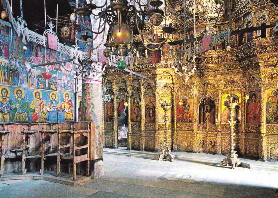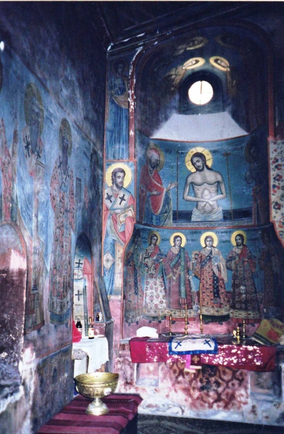 Επιπρόσθετες εργασίες, από τον πρώην Ηγούμενο Νικ.Παυλόπουλο+ στον ναό έδειξαν, ότι ο ανατολικός και ο βόρειος τοίχος ανήκουν κατά το μεγαλύτερο μέρος στον παλαιό, πριν του 1795, ναό. Αυτά φαίνονται και τώρα, όταν επισκεφθεί κανείς το μοναστήρι. Έτσι αποκαλύφθηκε το παλιό διακονικό με τις ωραίες τοιχογραφίες του, το σύνθρονο του ναού, μέρος του βορινού τοίχου με τρία παράθυρα και τις τοιχογραφίες τους και κομμάτι μιας αψίδας, που συνέδεε το διακονικό με το ιερό βήμα. Τις τοιχογραφίες αυτές του 16ου αιώνα, «αφάνταστου κάλλους, αυστηράς βυζαντινής τεχνοτροπίας, πρωτότυποι και ως θέματα και ως μορφαί» (Εκκλησιαστική Ιστορία Λέσβου. Μητροπολίτης Ι.Κλεόμβροτος), δημοσίευσε στο άρθρο του ο Ι. Μουτζούρης στον Α΄ τόμο της Μυτιλήνης. Συγκεκριμένα, στο διακονικό με τις δύο αχιβάδες, διατηρούνται «Η πορεία προς Εμμαούς. Η σφαγή των νηπίων της Βηθλεέμ, οι Άγιοι Φωκάς-Βαβύλας, Δανιήλ Στυλίτης, Ιακώβ και υιοί αυτού, η Άκρα Ταπείνωσις, Ιωάννης ο Νηστευτής, Διάκονος Άβιδος ο Σωτήρ και Διονύσιος Αρειοπαγίτης. Επίσης σε άλλο σημείο διασώζονται (με τραύματα από καλέμι), οι όρθιες μορφές των : Κλήμης ο Ρώμης, Γρηγόριος ο Διάλογος, Αθανάσιος ο Αλεξανδρείας και Κύριλος Αλεξανδρείας. Τέλος στην αψίδα παραθύρου υπάρχει ο Αρχάγγελος Γαβριήλ. Από τα μικρά παράθυρα του ανατολικού τοίχου, διακρίνεται ο τοίχος του παλιού ναού, που «εγκιβωτίστηκε στους μεταγενέστερους. Μετά την ανακαίνιση του 1795, αγιογραφήθηκε ολόκληρος ο ναός το 1800, από τον Νικηφόρο τον Αγιορείτη. Το υπερυψωμένο κλίτος φέρει οροφή επίπεδη, ξύλινη, αποτελούμενη από διακόσμηση με ρόδακες, ρόμβους και δικτυωτό στα κυρτά πλάγια, κατασκευασμένη από έγχρωμες πήχες, γνωστή τεχνική στους ναούς του 18ου αι. Είναι ένα ωραίο σύνολο με το πράσινο, ερυθρό λευκό, κίτρινο, χρυσό χρώμα. Μέσα στα πράσινα διάχωρα του δικτυωτού πλέγματος, υπάρχουν μικρά άνθη! Από τους ρόδακες κρέμονται πολυέλαιοι και κανδήλες! Δυστυχώς και εδώ υπάρχουν και αυτά τα βαριά πολυέλαια από μπρούτζο, μια κακή εικόνα στα εκκλησιαστικά μνημεία του νησιού. Τα μεγάλα τόξα του ναού, που χωρίζουν τα χαμηλά .πλάγια κλίτη, στηρίζονται σε κίονες με κορινθιάζοντα κιονόκρανα, με χρωματική απεικόνιση ορθομαρμάρωσης. Σίγουρα πρόκειται για γύψινο επικάλυμμα κορμών κυπαρισσιών! Εντύπωση προκαλεί και ο ημικυκλικός χώρος από τα στασίδια των ψαλτών, γύρω από το μικρό αναλόγιο. Η αγία Τράπεζα, στο ιερό, καλύπτεται από περίτεχνο «ουρανό», που είναι κατασκευασμένος από ξυλόγλυπτα μέλη, κιονίσκων, φυτικής διακόσμησης, βαρύ κάλυμμα και χρωματική αρμονία! Το καθολικό αποτελεί ένα σύνθετο μνημείο της εκκλησιαστικής αρχιτεκτονικής και διακόσμησης, στους αιώνες της εκκλησιαστικής ιστορίας της Λέσβου.