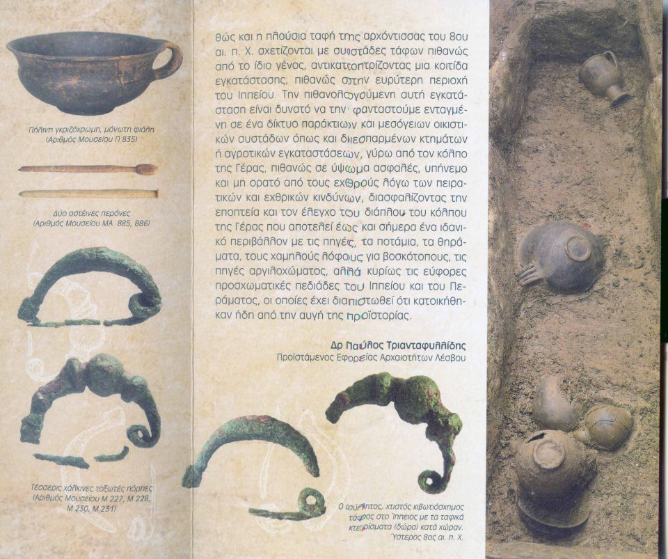 Στο ίδιο τόπο, στο Ίππειος, σε δρόμο, δίπλα στο Κάτω Τζαμί, η ιστορία βυθίζεται πάλι με ένα σημαντικό τάφο, στον 8ο αι. π.Χ. Γεωμετρική Λέσβος, οι πόλεις κράτη έχουν αποκτήσει τις επικράτειές τους, σε κατώτερα στρώματα βρίσκεται η περίφημη γκρίζα κεραμική, τα εργαστήρια την φτιάχνουν από την μέση Χαλκοκρατία μέχρι και τα Κλασσικά χρόνια! Οι κοινωνικές τάξεις, σκοτεινές μέσα στις υποθέσεις, μπλέκονται ανάμεσα στους Αχαιούς και στους νεοφερμένους Αιολείς! Ο τάφος ανήκε σε μια «αρχόντισσα», απλός, χτιστός με πέτρες και σκεπασμένους με σχιστόλιθους, όμως γεμάτος με κτερίσματα, όπως τα χαρακτηριστικά γκριζόμαυρα, γυαλιστερά αγγεία της Λέσβου, τις χάλκινες τοξωτές πόρπες από το φόρεμα της και τα χρυσά κοσμήματα, της κοινωνικής της τάξης, σκοτωμένη από «ατύχημα ή σεισμό»! Σίγουρα γυναίκα μεγαλόσχημου τοπικού άρχοντα του κάμπου! Οι πόλεις έχουν αποκτήσει τα Ιερά τους, σίγουρα στηρίγματα της Αριστοκρατίας, της «κοινωνικής εξουσίας», στην οποία ανήκε και η Αρχόντισσα του Ιππείους. Στην ακρόπολη της Πύρρας εμφανίζεται το αψιδωτό ιερό, ίσως του Απόλλωνα (8ος αι. π.Χ.), στη Μυτιλήνη το αψιδωτό ιερό της Κυβέλης (7ος αι. π.Χ.), στην Άντισσα, τα δύο αψιδωτά, διαδοχικά, «ιερά» (9ος αι. - 7ος αι. π.Χ.) και στον ιερό λόφο της Κλοπεδής, επάνω στο Μυκηναϊκό «πεδίο» το γεωμετρικό ιερό της γυναικείας θεότητας (ίσως Άρτεμης, του 8ου αι. π.Χ.)! Πού ήταν το αρχοντικό της γυναίκας του Ιππείους; Ίσως βρεθούν κι άλλα στοιχεία! Ήταν εκεί επάνω, στην Κουδουνόπετρα, σ’ ένα οχυρωμένο τόπο της περιοχής; Δεν υπάρχει όμως κεραμική αυτής της εποχής εκεί! Σίγουρα έλεγχαν τον μεγάλο εύφορο κάμπο, με τα ποτάμια από τις γύρω πλαγιές! Μια τέτοια οχυρή θέση, που δένεται και με την πιθανή δημιουργία ακροπόλεων, των χαμένων στον χρόνο και τον τόπο του Αιγαίου, «Ετρούσκων», με γκρίζα ανάλογη κεραμική, αναγνωρίστηκε στην θέση του Μεσαιωνικού Κάστρου, στην θέση Μέτι της Γέρας! Αυτό το Μέταον των «Τυρρηνών», στην εντυπωσιακή και απόμακρη αυτή περιοχή των νότιων παραλίων, ίσως αποτελεί ένα κρίκο μιας αλυσίδας στην πρώιμη αυτή ιστορία του νησιού, στην οποία ανήκει η αρχόντισσα του Ποιους. Τα Γένη των Αιολέων που κυβερνούν τις πόλεις-κράτη και η προγενέστερη, κραταιά Μυκηναϊκή Λέσβος, που δεν θα μάθει ποτέ κανείς πώς δέχτηκε τους νεοφερμένους, στον μεγάλο οικισμό της - κέντρο στον κόλπο της Γέρας με τις οχυρωμένες της ακροπόλεις, στου Κοκότση, στη Σκάλα των Λουτρών και σε τόσους άλλους μικρότερους οικισμούς (Ακρωτήρι Πετεινός, Καληώρια Σκουτάρου κ.α.)! Τι έγινε με αυτούς τους ντόπιους «Μυκηναίους» απέναντι στους Αχαιούς της Τρωικής εκστρατείας; Τι βρήκαν λοιπόν οι Αιολείς εδώ;