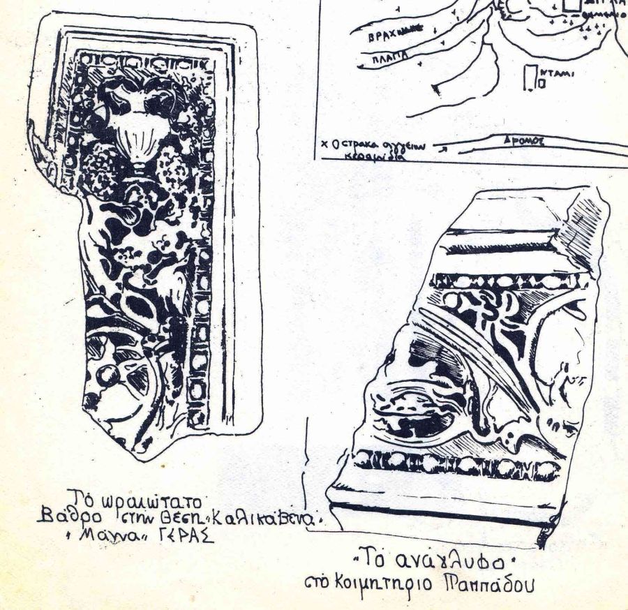 Θα επιχειρήσω μια υπόθεση, ότι πρόκειται για πιθανό επιστύλιο αρχαίου κτηρίου και ότι η ανάγλυφη παράσταση (ίσως μισή), της βορινής πλευράς αφορά το Κέρας της Αμάλθειας της Θεάς Τύχης.