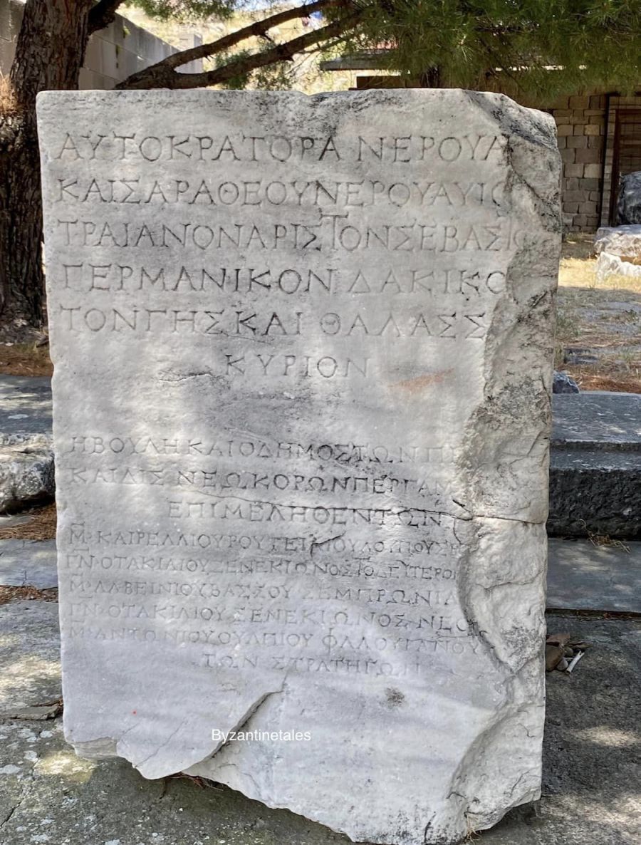 Την παλιά μου δημοσίευση έρχεται να ενισχύσει η δημοσίευση νομίσματος της αρχαίας Ερεσού, στην πρόσθια όψη του οποίου υπάρχει η Προτομή του Τραϊανού (ΚΑΙΣΑΡΟΣ ΝΕΡΟΥΑ ΤΡΑΙΑΝΟΥ ΓΕΡΜΑΝΙΚΟΥ) και στην οπίσθια ο Απόλλων, όρθιος, γυμνός (με κλαδί στο δεξί χέρι και στήριγμα τρίποδα, στο αριστερό) και η αναγραφή ΕΡΕCΙ.***** H πόλη λοιπόν έκοψε και νόμισμα προς τιμήν του σημαντικού Στρατιώτη- Αυτοκράτορα, που άφησε τεράστιο έργο στην Αυτοκρατορία και νίκες του στα βόρεια (Δακιτικό) και στην ανατολή. Στην ακρόπολη της Περγάμου, του αφιερώθηκε ναός (Αδριάνειον) και τιμητικές αφιερωματικές επιγραφές του ΔΗΜΟΥ ΚΑΙ ΤΗΣ ΒΟΥΛΗΣ. Σε μια από αυτές αναφέρεται «ΑΥΤΟΚΡΑΤΟΡΑ ΝΕΡΟΥΑΝ (Ο Νέρβας τον οποίο διαδέχτηκε ο Τραϊανός)/ΚΑΙΣΑΡΑ ΘΕΟΥ ΝΕΡΟΥΑ ΥΙΟΝ/ΤΡΑΙΑΝΟΝ ΑΡΙΣΤΟΝ ΣΕΒΑΣΤ{ΟΝ}/ΓΕΡΜΑΝΙΚΟΝ ΔΑΚΙΚΟ{Ν}/ΤΟΝ ΓΗΣ ΚΑΙ ΘΑΛΑΣΣ{ΗΣ}/ΚΥΡΙΟΝ»******