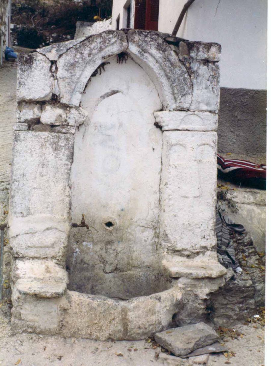 Διακόσια περίπου μέτρα ανατολικά, μέσα στο επίπεδο ελαιόκτημα βρίσκεται η Κρήνη, η οποία αποκαλύφθηκε από τον ιδιοκτήτη (Ήταν μισοχωμένη στο χώμα). Με την πρόσοψη προς το ποτάμι, αποτελείται από κτίσμα με αλάξευτη πέτρα και κουρασάνι, χωρίς χαζινέ, μάλλον σε συνεχή ροή, στον δρόμο. Η πρόσοψη αποτελείται από Τόξο με δύο τμήματα, από τα οποία το δεξιό είναι σπασμένο στο έδαφος. Ο ντόπιος, ανοιχτόχρωμος μπεζ-καφέ Ιγκνιβρίτης αποτελεί το υλικό. Με το ίδιο υλικό είναι κατασκευασμένος ο δεξιός πεσσός, ενώ ο αριστερός είναι από το γκρίζο, ντόπιο μάρμαρο. Από μάρμαρο είναι κατασκευασμένα επίσης τα δύο πεζούλια, όλο το στηθαίο (πλάκες κάτω από το τόξο και της εκροής) που φέρει σπασμένο ανάγλυφο στόμιο. Επίσης η γούρνα από την οποία λείπει η πρόσθια πλάκα. Το τόξο έχει διπλή εσωτερική παρυφή, που έρχεται και εφάπτεται με το αντίθετο τμήμα, σχηματίζοντας το οξύληκτο, Οθωμανικό μοτίβο. Στο δεξιό, σπασμένο τμήμα του, διακρίνεται χαραγμένο το Πεντάλφα, εραλδικό σημάδι του μάστορα (γνωστά από πληθώρα κτισμάτων, όπως π.χ. του Ταξιάρχη του Παππάδου). Δίπλα του υπάρχει και άλλο χάραγμα, ίσως δυσανάγνωστη ημερομηνία. Το μοτίβο του τόξου, παρατηρείται και σε Κρήνη, του παλιού Οθωμανικού χωριού της Κώμης. Από τον τύπο η κρήνη ανήκει στον18ο, αρχές του 19ου αι. Αποτελεί ακόμα μια Κρήνη, της αγροτικής περιμέτρου της Γέρας.