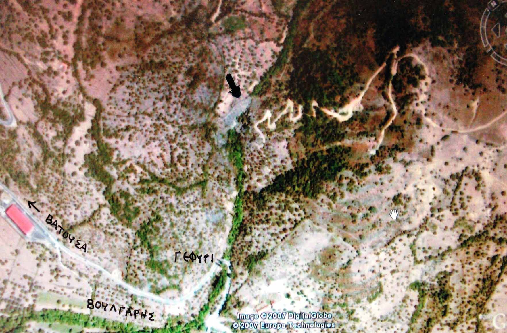 Συνεχίζοντας ο αμαξιτός, έρχεται στο μεγάλο γεφύρι, πριν την ανηφόρα για τα Χύδηρα. Ο δρόμος αφού κατηφορίσει, φθάνει στο ποτάμι, που δίνει την ζωή σ’ όλη την περιοχή. Από εδώ ξεκινά ο Βούλγαρης, το ποτάμι που ρίχνει τα νερά του στην Αρχαία Άντισσα, κάτω στον Κούλουβο. Η βλάστηση είναι πυκνή εδώ κάτω. Τα πλατάνια στολίζουν το ποτάμι. Μέσα από μια ρεματιά, έρχεται, όπως γράψαμε, να ρίξει τα νερά του το ρέμα απ’ την Φτερούντα. Το παλιό πέτρινο τοξωτό γεφυράκι, ξεχασμένο τώρα μέσα στις φυλλωσιές, έδωσε την θέση του στο μεγάλο τσιμεντένιο. Εδώ είδα δίπλα στο δρόμο να ανθίζει το Ροδόδενδρο (Rhododendron Luteum), ο αγούδουρας των ντόπιων, που εδώ στη Λέσβο μόνο έχουμε το προνόμιο να το έχουμε, απ’ όλη την Ευρώπη. Παρόλο που δηλητηριάζει τα «άφρονα ζώα», που θα τον γευτούν, ο θάμνος με τα κίτρινα ευωδιαστά του κρινάκια, είναι «χάρμα οφθαλμών». Έρχεται το άλλο παρακλάδι από τα νότια, φτάνοντας τις απαχές του κοντά στην Άγρα και συμβάλλει σ’αυτό από την Φτερούντα. Κάτω από το γεφύρι, στην βόρεια όχθη του Βούλγαρη, βρίσκεται, ερείπιο πια, σκεπασμένο με κισσό ο πρώτος Νερόμυλος του χωριού. Και αυτός ανήκε στον Βακιρλή. Εδώ βρίσκεται και το παλιό λιθόστρωτο, που περνούσε από το μικρό, δικάμαρο γεφυράκι. Ζώα, πλατάνια, δρύες, σέτια αμπελιών και σιταριού, αλώνια, γούρνες και μάντρες παντού. Εκατό μέτρα πιο κάτω, στην νότια όχθη του ποταμού, υπάρχει και ο δεύτερος ερειπωμένος Νερόμυλος, με τριγωνική δεξαμενή. Αυτός ανήκε στον Καλογερά. Ο μύλος αγοράστηκε από τον Λεβεντάκη, που έφτιαξε Ελαιοτριβείο και πετρελαιοκίνητο αλευρόμυλο, στο χωριό. Ξαναλειτούργησε από τον Καλογερά, στην Γερμανική Κατοχή, με την έλλειψη πετρελαίου. Είδαμε λοιπόν στο πρώτο μέρος, ένα νερόμυλο της Βατούσας και δύο των Χυδήρων .