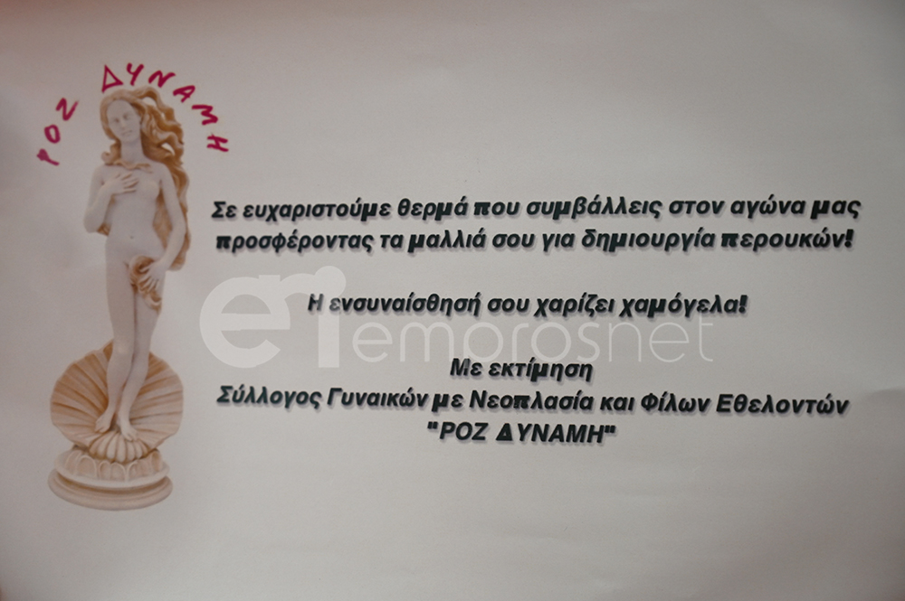 Έτσι το καρέ της ανθρωπιάς «λάνσαραν» όλοι όσοι κουρεύτηκαν προσφέροντας τα μαλλιά τους για δημιουργία περουκών για άτομα που πάσχουν από καρκίνο, κατά την διάρκεια της εκδήλωσης που πραγματοποιήθηκε το πρωί της Δευτέρας 16 Ιανουαρίου 2023 στο Πολύκεντρο Μυτιλήνης την οποία διοργάνωσαν το Σωματείο Κομμωτών - Κουρέων Λέσβου, παρουσία των μαθητών του ΔΙΕΚ, μετά από κάλεσμα του Συλλόγου Γυναικών με Νεοπλασία & Φίλων Εθελοντών «ΡΟΖ Δύναμη».