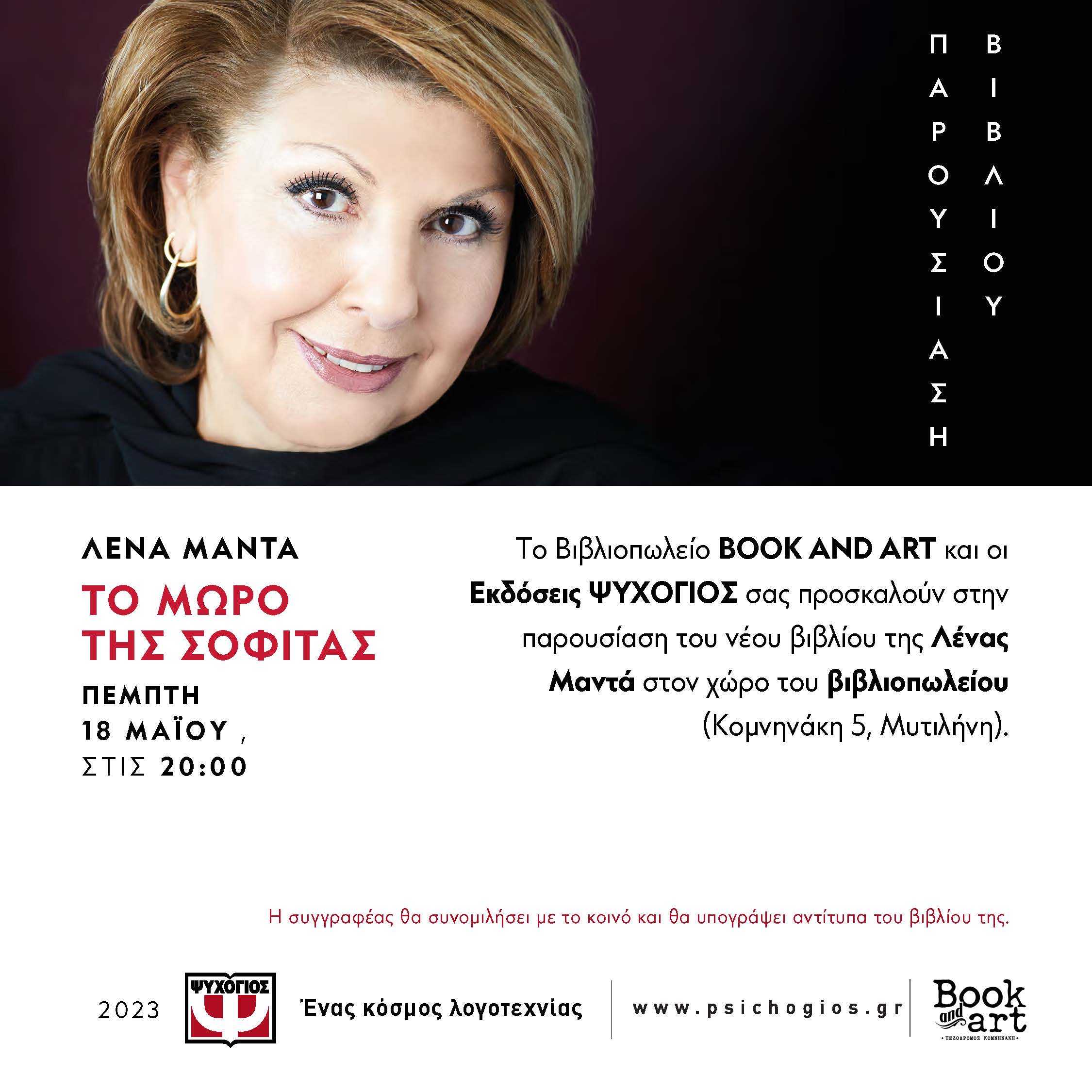 Στην Λέσβο θα βρίσκεται τις επόμενες ημέρες η συγγραφέας Λένα Μαντά καθώς το Βιβλιοπωλείο BOOK & ART και οι Εκδόσεις ΨΥΧΟΓΙΟΣ παρουσιάζουν την Πέμπτη 18 Μαΐου, στις 20:00, το νέο βιβλίο της «Το μωρό της Σοφίτας» στο χώρο του βιβλιοπωλείο (Κομνηνάκη 5 Μυτιλήνη).