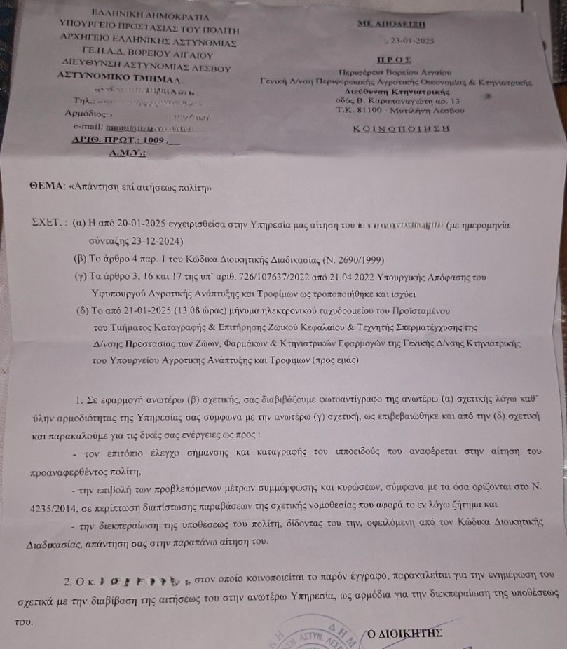 Το έγγραφο «φωτιά» της Αστυνομίας στην Δ/νση Κτηνιατρικής της Περιφέρειας Βορείου Αιγαίου