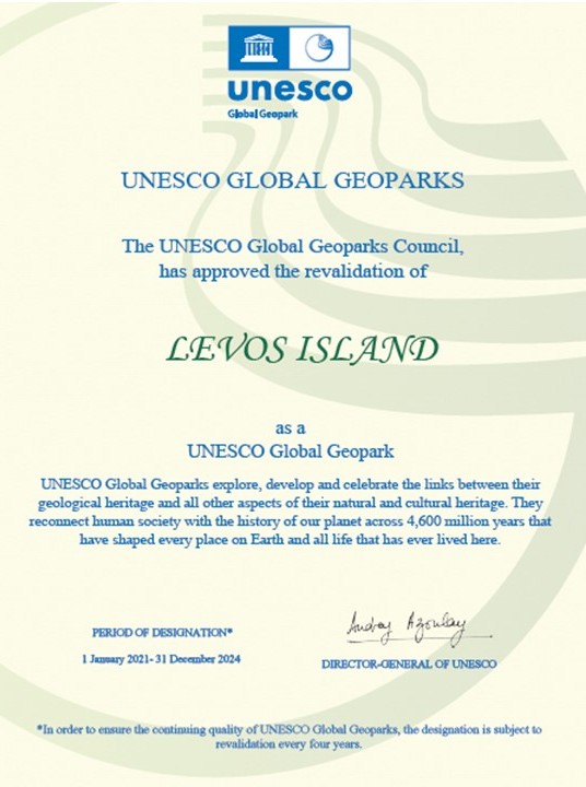 Το πιστοποιητικό αναγνώρισης υπογράφει η Γενική Διευθύντρια της UNESCO κα. Audrey Azoulay και πιστοποιεί ότι η Λέσβος αναγνωρίζεται ως ΠΑΓΚΟΣΜΙΟ ΓΕΩΠΑΡΚΟ UNESCO για την τετραετία 2021-2024, στο τέλος της οποίας θα ακολουθήσει νέα επαναξιολόγηση προκειμένου να διαπιστωθεί η επιτυχής συνέχιση των δράσεων ανάδειξης και αξιοποίησης της φυσικής και πολιτιστικής κληρονομιάς της Λέσβου, για τις οποίες και απονεμήθηκε η διάκριση.