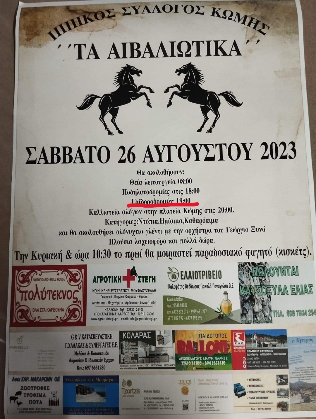 Οι Γαϊδουροδρομίες, διοργανώθηκαν, όπως προκύπτει από το σχετικό υλικό, το Σάββατο 26 Αυγούστου, από τον Ιππικό Σύλλογο Κώμης ΤΑ ΑΙΒΑΛΙΩΤΙΚΑ.
