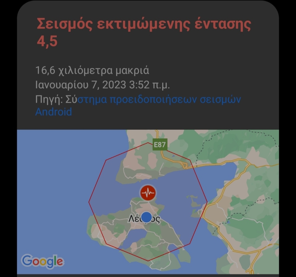 Σεισμός 4,5 Ρίχτερ σημειώθηκε τις πρώτες πρωινές ώρες του Σαββάτου 7 Ιανουαρίου 2023 [03:52] βόρεια της Λέσβου.