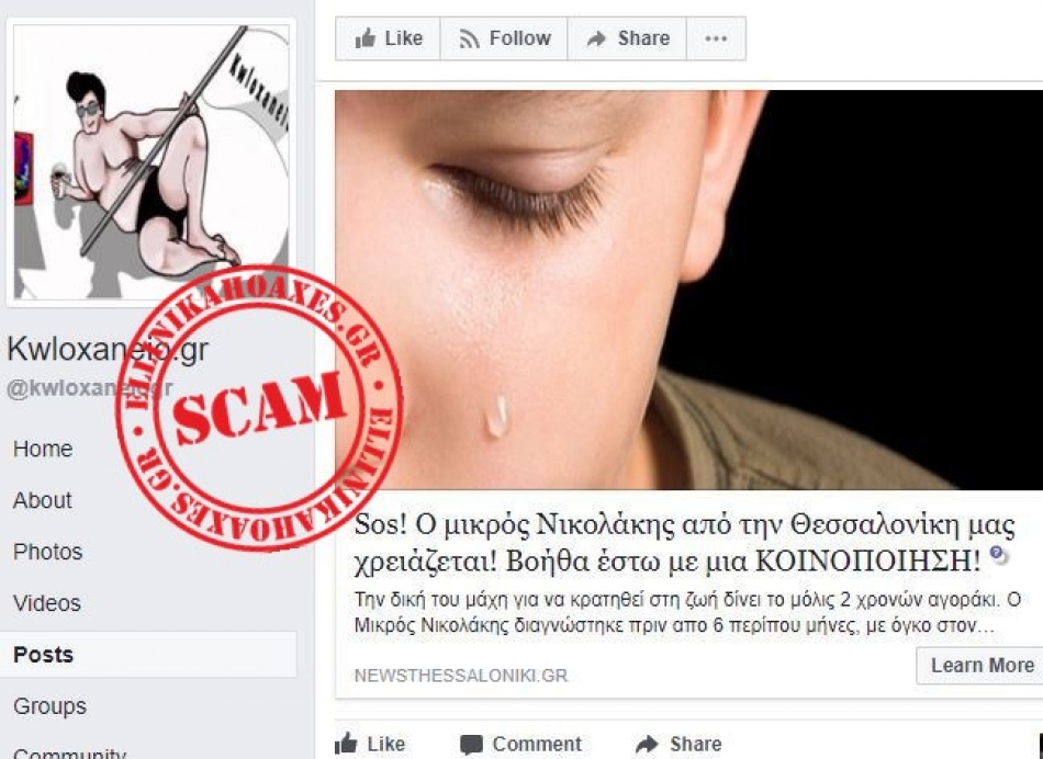 Η ομάδα των «Ελληνικά Hoaxes» που έχει στόχο την κατάρριψη αναληθών δημοσιευμάτων στο ίντερνετ, αποκάλυψε την επικινδυνότητα ενός δημοσιεύματος ιστοσελίδας της Θεσσαλονίκης, που έκανε έκκληση για συγκέντρωση χρημάτων, με την ιστορία ενός μικρού αγοριού από τη Λέσβο που παρουσιάζει πρόβλημα υγείας και για το σκοπό αυτό γίνεται έρανος. Το επικίνδυνο δημοσίευμα έγραφε σχετικά με τον «μικρό Νικολάκη που πάσχει από όγκο στον εγκέφαλο και προκειμένου να μεταβεί σε εξειδικευμένο κέντρο του εξωτερικού για να θεραπευτεί, θα πρέπει να συγκεντρωθούν τα απαραίτητα χρήματα».