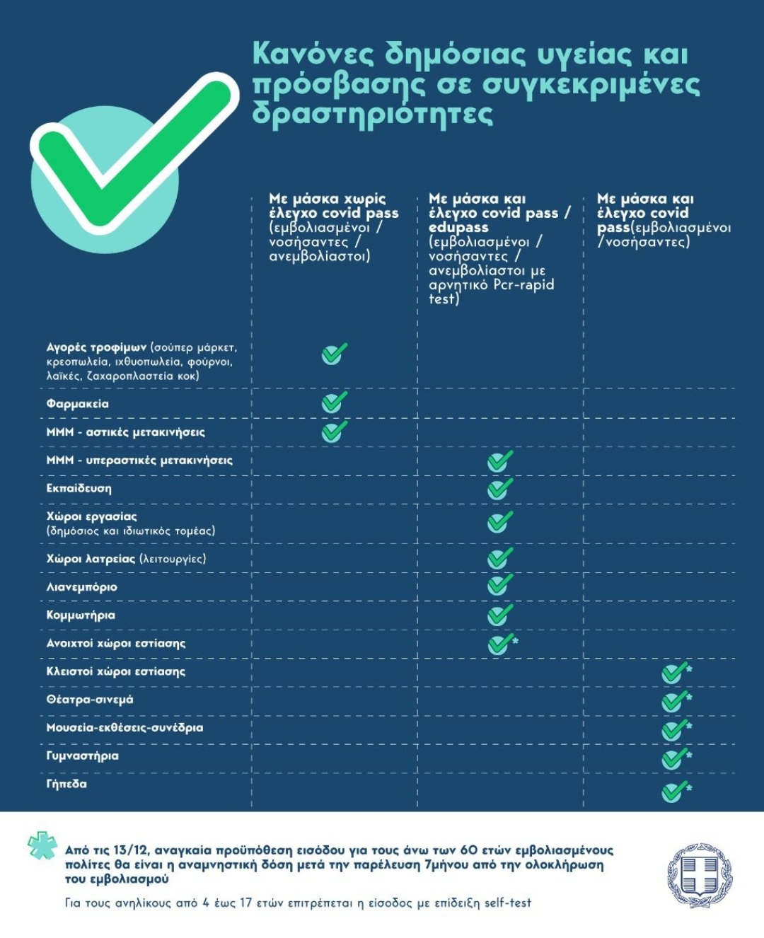Σε ΦΕΚ στην Εφημερίδα της Κυβέρνησης δημοσιεύθηκε η απόφαση για τα «Έκτακτα μέτρα προστασίας της δημόσιας υγείας από τον κίνδυνο περαιτέρω διασποράς του κορωνοϊού COVID-19 στο σύνολο της Επικράτειας, για το διάστημα από τη Δευτέρα, 22 Νοεμβρίου 2021 και ώρα 06:00 έως και τη Δευτέρα, 6 Δεκεμβρίου 2021 και ώρα 06:00». Σε αυτό επισημαίνεται ότι από αύριο, Δευτέρα 22/11, όσοι πολίτες δεν έχουν πιστοποιητικό εμβολιασμού ή νόσησης δεν θα μπορούν να εισέρχονται στους εξής 9 χώρους: