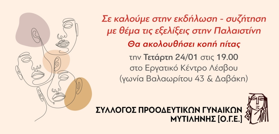 Ο Σύλλογος Προοδευτικών Γυναικών Μυτιλήνης καλεί τις γυναίκες της Λέσβου σε εκδήλωση – συζήτηση για τις «Εξελίξεις στην Παλαιστίνη» την Τετάρτη 24 Ιανουάριου 2024 στις 7:00 το απόγευμα στο Παλλεσβιακό Εργατοϋπαλληλικό Κέντρο (γωνία Βαλαωρίτου 42 & Δαβάκη). Θα ακολουθήσει κοπή πίτας.