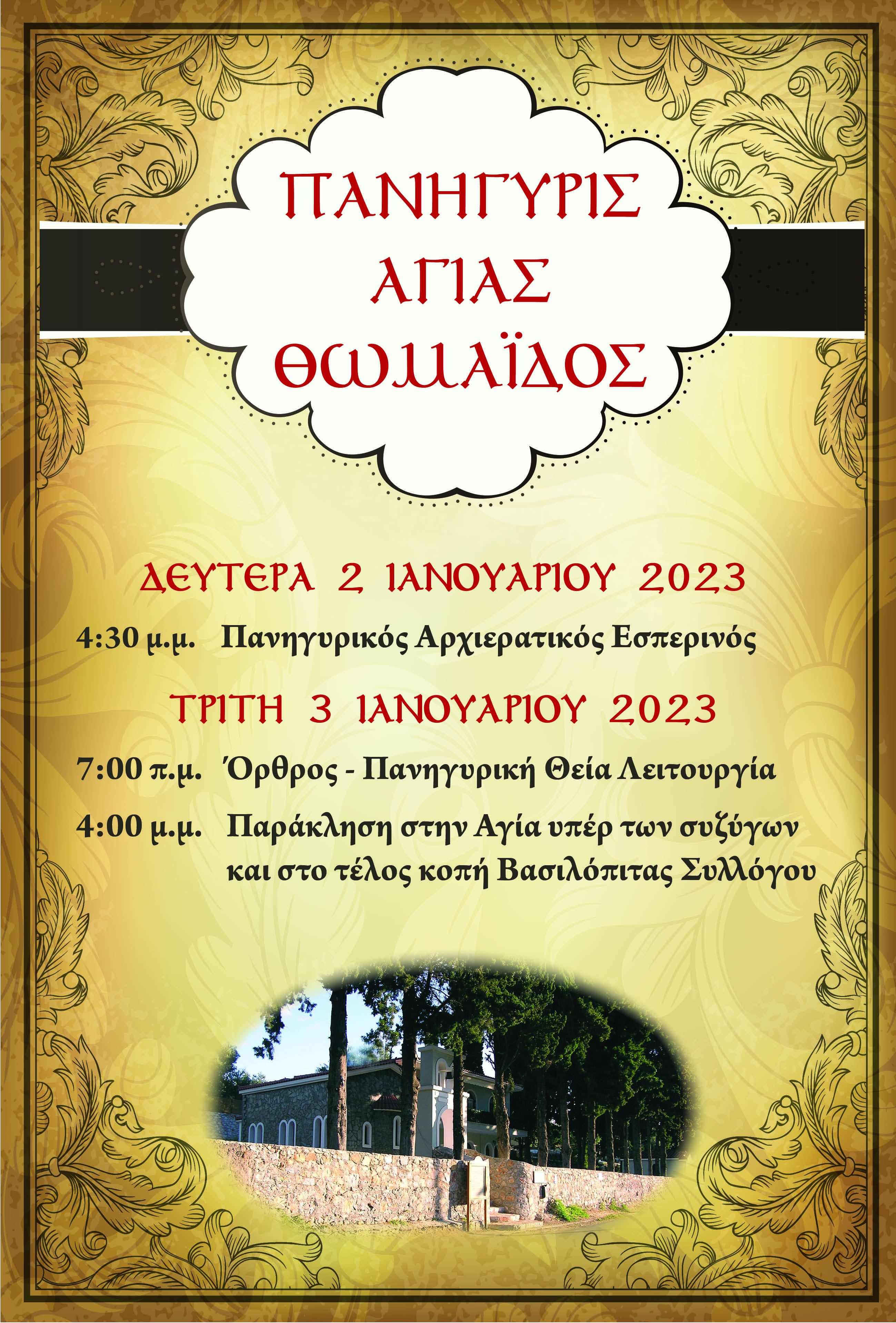 Στις 3 Ιανουαρίου 2023 πανηγυρίζει ο Ναός της Αγίας Θωμαΐδος της εκ Λέσβου, προστάτιδας της συζυγίας, επί της οδού Θεοφίλου Χατζημιχαήλ, πίσω από το Βοστάνειο Νοσοκομείο.