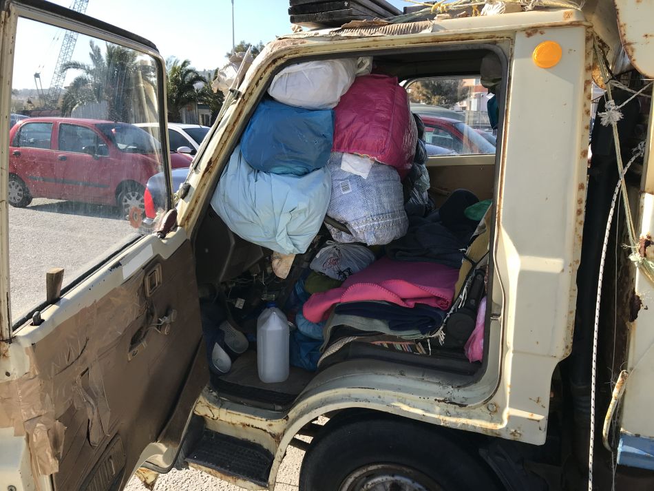 Κάθε βράδυ βγάζει τις χαρτόκουτες για να μπορέσει να ανοίξει το φορτηγάκι και να κοιμηθεί. «Εδώ κοιμάμαι» μας λέει και μας δείχνει τα ελάχιστα εκατοστά χώρου που έχει για να πλαγιάσει, αφού πάνω στο τιμόνι είναι δεκάδες πλαστικές σακούλες παραγεμισμένες με τα ρούχα του.