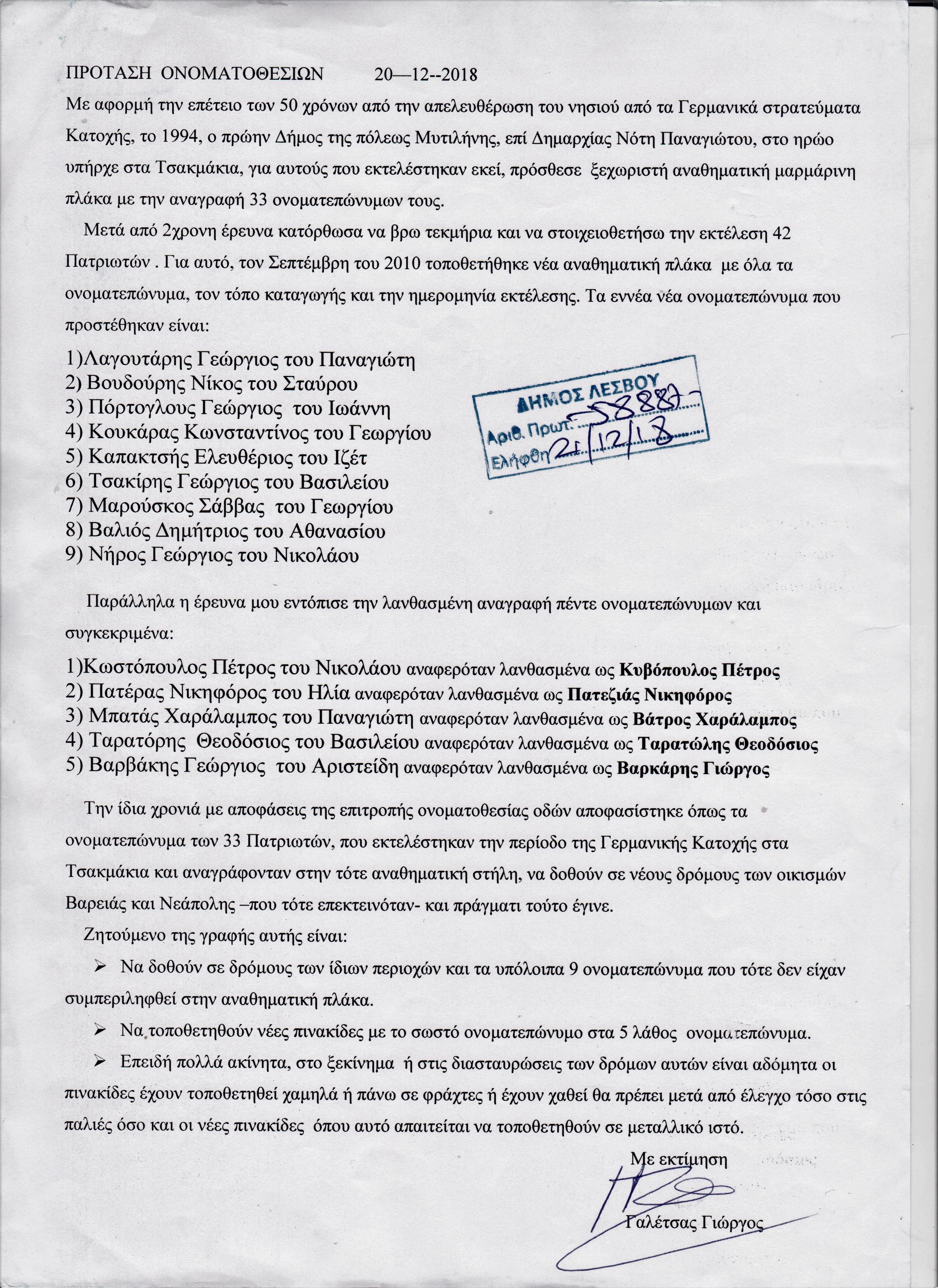 Στην επιστολή σημειώνεται: «Δύο φορές μέχρι σήμερα, στάλθηκε στην δημοτική αρχή, υπόμνημα του συγγραφέα Γιώργου Γαλέτσα, για τις επιβαλλόμενες συμπληρώσεις και διορθώσεις, των ονομάτων των 42 εκτελεσμένων συμπατριωτών μας, σε οδούς της Μυτιλήνης (στις 20-12-2018 με αριθμό πρωτοκόλλου 58887 και στις 9-5-2022 με αριθμό πρωτοκόλλου 14261 ). Σαν σήμερα 23 Μαρτίου, έγινε το 1942 η πρώτη ομαδική εκτέλεση τεσσάρων συμπατριωτών μας από τους ναζί κατακτητές στα Τσαμάκια, αναγκαζόμαστε να επανέλθουμε, αφού δυστυχώς καμιά διαδικασία δεν έγινε μέχρι τώρα, επισημαίνοντας τα παρακάτω :