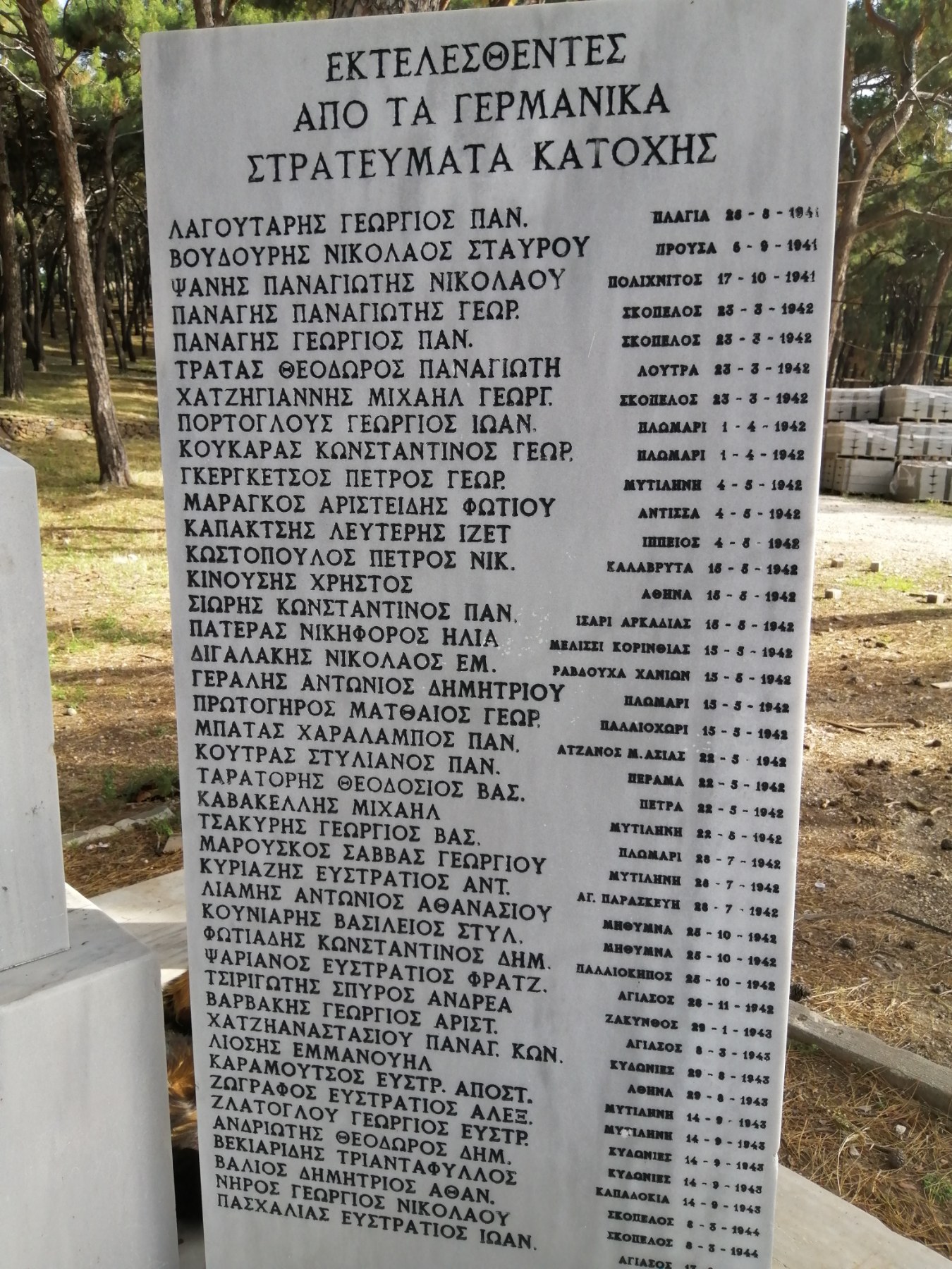 ---Μετά από 2χρονη έρευνα κατόρθωσα να βρω τεκμήρια και να στοιχειοθετήσω την εκτέλεση 42 Πατριωτών . Για αυτό, τον Σεπτέμβρη του 2010 τοποθετήθηκε από το Δήμο, νέα αναθηματική πλάκα με όλα τα σωστά ονοματεπώνυμα, τον τόπο καταγωγής και την ημερομηνία εκτέλεσης. Τα εννέα νέα ονοματεπώνυμα που προστέθηκαν είναι: