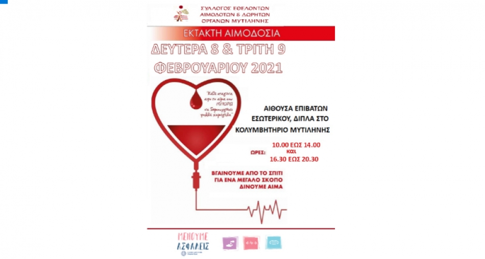 Ο Σύλλογος Εθελοντών Αιμοδοτών και δωρητών οργάνων Μυτιλήνης διοργανώνει την εθελοντική αιμοδοσία στη Μυτιλήνη Δευτέρα 8 και Τρίτη 9 Φεβρουαρίου 2021, από τις 10:00 έως τις 14:00 και από 16:30 έως 20:30 στην αίθουσα αναμονής δίπλα στο Κολυμβητήριο Μυτιλήνης.