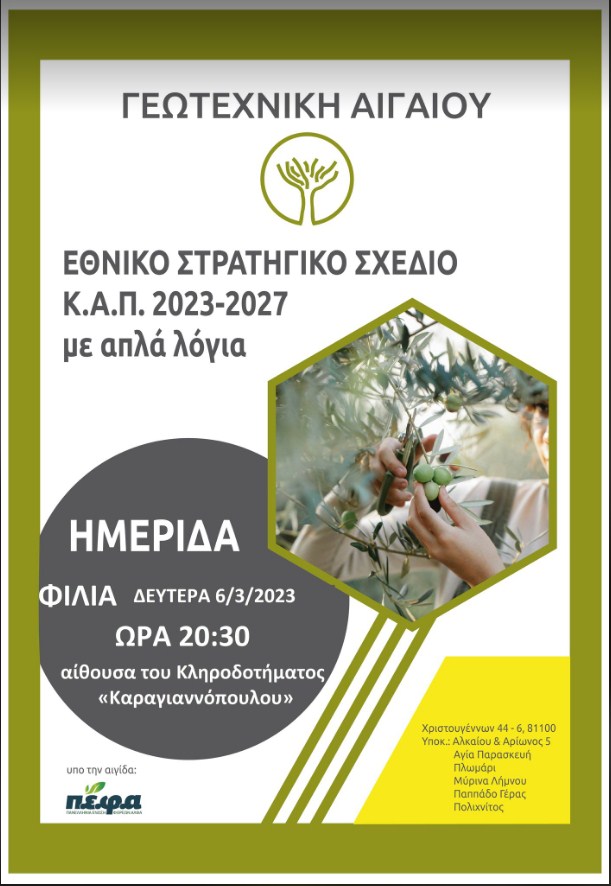 Την Δευτέρα 6 Μαρτίου 2023, στις 20:30 στην αίθουσα Κληροδοτήματος «Καραγιαννόπουλου» στην Φίλια, θα πραγματοποιηθεί ημερίδα ενόψει της νέας Κοινής Αγροτικής Πολιτικής και του Εθνικού Στρατηγικού Σχεδίου 2023-2027.