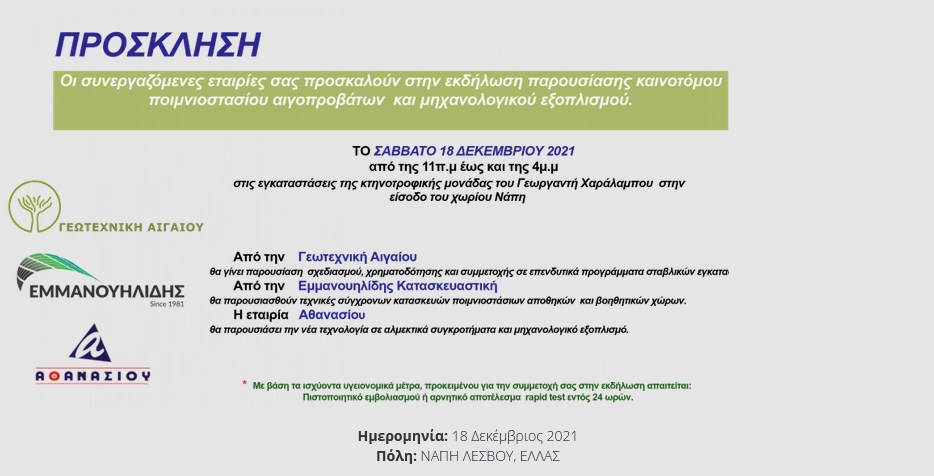 Οι εταιρίες Γεωτεχνική Αιγαίου γεωργικοί σύμβουλοι, η Εμμανουηλίδης κατασκευαστική και η Αθανασίου αλμεκτήρια και εξοπλισμοί ένωσαν τις δυνάμεις τους και οργανώνουν για πρώτη φορά στη Λέσβο παρουσίαση ολοκληρωμένων λύσεων στην υλοποίηση επενδύσεων στην κτηνοτροφία.