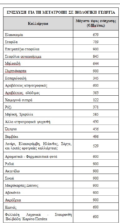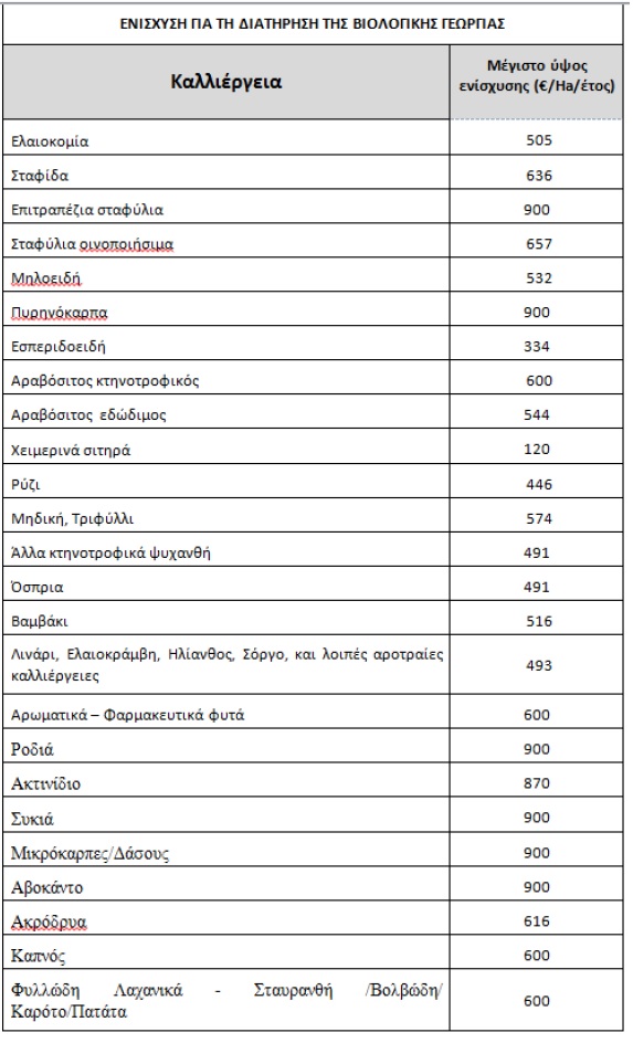 Παράλληλα με την τροποποίηση του προγράμματος αγροτικής ανάπτυξης διευρύνονται οι επιλέξιμες καλλιέργειες για τη «Βιολογική Γεωργία» καθώς επίσης τροποποιούνται οι αρχές των κριτηρίων επιλογής του μέτρου για την καλύτερη ανταπόκρισή τους στην πληθώρα των αιτημάτων για τις δράσεις του μέτρου. Τα ανωτέρω θα ισχύσουν για την 2η πρόσκληση του μέτρου. Οι καλλιέργειες που είναι επιλέξιμες για την παραγωγή βιολογικών προϊόντων είναι η ελιά, η σταφίδα, τα επιτραπέζια σταφύλια, τα οινοποιήσιμα σταφύλια, τα μηλοειδή, τα πυρηνόκαρπα, τα εσπεριδοειδή, ο αραβόσιτος κτηνοτροφικός και εδώδιμος, τα χειμερινά σιτηρά, το ρύζι, η μηδική, το τριφύλλι, άλλα κτηνοτροφικά ψυχανθή, τα όσπρια, το βαμβάκι, το λινάρι, η ελαιοκράμβη, ο ηλίανθος, ο σόργος, άλλες αροτραίες καλλιέργειες, τα αρωματικά και φαρμακευτικά φυτά, η ροδιά, το ακτινίδιο, η συκιά, μικρόκαρπες καλλιέργειες δάσους (φρούτα του δάσους), το αβοκάντο, τα ακρόδρυα, ο καπνός, τα φυλλώδη λαχανικά, τα σταυρανθή, τα βολβώδη κηπευτικά, το καρότο και η πατάτα. Το ύψος των ενισχύσεων ανά εκτάριο όπως διαμορφώνονται για μετατροπή καλλιεργειών από συμβατικές σε βιολογικές και για διατήρηση καλλιεργειών σε βιολογική κατάσταση αναγράφεται στους διπλανούς πίνακες. Στους σχετικούς πίνακες αναγράφονται και οι ενισχύσεις για διατήρηση και μετατροπή κτηνοτροφικών εκμεταλλεύσεων από συμβατικές σε βιολογικές.