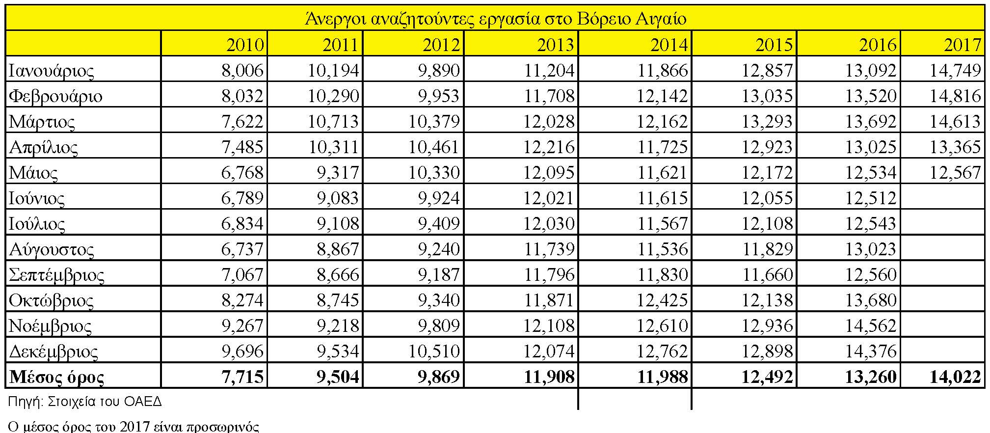 Ο μέσος όρος των ανέργων που αναζητούν εργασία στο πρώτο πεντάμηνο του έτους στο βόρειο Αιγαίο, διαμορφώθηκε στους 14.022, όταν το πρώτο πεντάμηνο του 2016 ήταν 13.173. Δηλαδή το πρώτο πεντάμηνο του έτους, ο αριθμός των ανέργων που αναζητούν εργασία στα νησιά της Περιφέρειας αυξήθηκε κατά 849 άτομα.