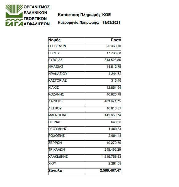 Στην ανακοίνωση αναφέρεται: «Κρατικές Οικονομικές Ενισχύσεις, συνολικού ύψους 2.598.835,16 ευρώ, θα καταβάλει ο ΕΛ.Γ.Α., αύριο Πέμπτη 11 Μαρτίου, σε 2.053 δικαιούχους παραγωγούς του Προγράμματος Κρατικών Οικονομικών Ενισχύσεων «Ετήσιο 2017», οι οποίοι ολοκλήρωσαν την αποκατάσταση των ζημιών στις πληγείσες γεωργικές τους εκμεταλλεύσεις ή είναι δικαιούχοι ενισχύσεων για απώλεια παραγωγής».