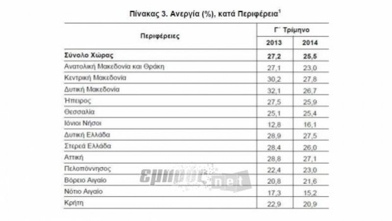 Ειδικότερα, το τρίτο τρίμηνο του έτους, δηλαδή την περίοδο Ιούλιος - Σεπτέμβριος 2014, σε πανελλαδικό επίπεδο η ανεργία υποχώρησε στο 25,5%, από το 27,2% που ήταν την αντίστοιχη περίοδο του 2013. Την ίδια πορεία ακολούθησε η ανεργία στα νησιά του Νοτίου Αιγαίου, όπου έπεσε στο 15,2% από 17,3%, και στην Κρήτη, όπου έπεσε στο 20,9% από το 22,9%.