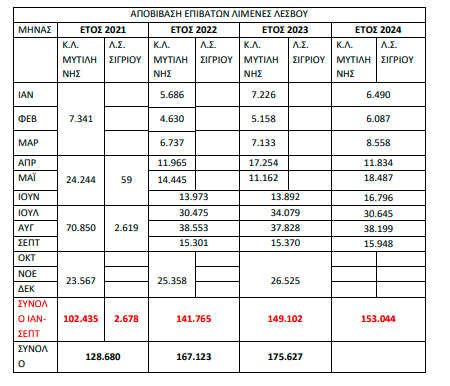 Σε ότι αφορά τα κρουαζιερόπλοια οι προσεγγίσεις στην Λέσβο για το 2024 ήταν 7 και ο συνολικός αριθμός επιβατών 3.430 όταν το 2023 οι προσεγγίσεις ήταν 9 και ο αριθμός των επιβατών 4.389. Βέβαια να θυμίσουμε ότι στην Λέσβο ο αριθμός των προσεγγίσεων κρουαζιεροπλοίων κάποτε άγγιζε τα 100 κατ’ έτος.
