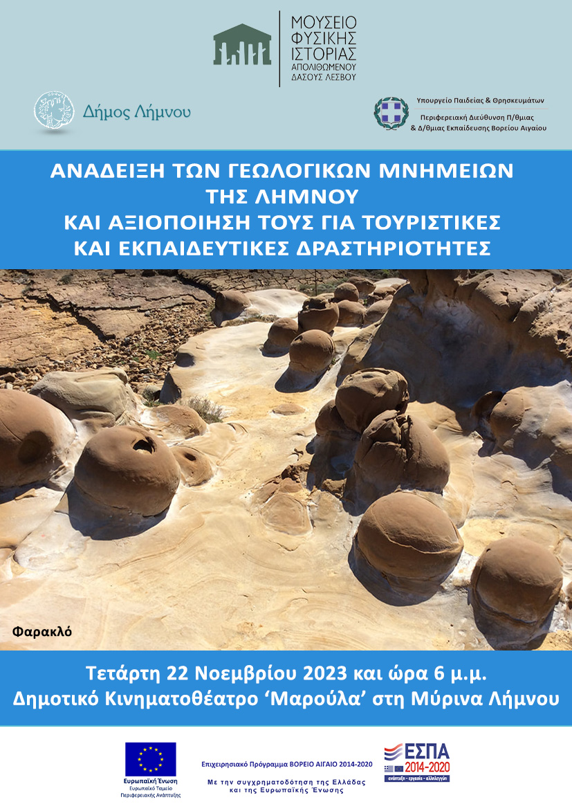 Εκδήλωση με θέμα ‘’Ανάδειξη των γεωλογικών μνημείων της Λήμνου και αξιοποίησή τους για τουριστικές και εκπαιδευτικές δραστηριότητες’’ θα πραγματοποιηθεί στη Μύρινα της Λήμνου την Τετάρτη 22 Νοεμβρίου 2023 & ώρα 6 μ.μ.