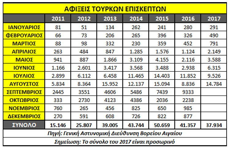Εκείνο που έχει αξία είναι ότι, με βάση τις άδειες των Τούρκων λόγω του «Κουρμπάν Μπαϊράμ», οι κρατήσεις που παρατηρούνται στη Λέσβο και για τις επόμενες ημέρες διατηρούνται σε αυξημένα επίπεδα. Και αναμφίβολα, εάν λόγω συγκυριών ο 10ήμερος αυτός «μποναμάς» Ερντογάν δεν «έσπαγε» στα δύο, καλύπτοντας τις τελευταίες μέρες του μήνα και τις αρχές του επόμενου, τα συνολικά στατιστικά νούμερα για τον Αύγουστο ίσως και να ξεπερνούσαν τελικά τον αριθμό ρεκόρ του 2013. Σε κάθε περίπτωση, οι αφίξεις μέσα στο 2017 είναι τόσες πολλές, που «φλερτάρουν» με ιστορικά υψηλά. Είναι χαρακτηριστικό ότι συνολικά φέτος, ως και το τέλος Αυγούστου, οι Τούρκοι επισκέπτες αγγίζουν σχεδόν τα περσινά νούμερα όλου του 2016, υστερώντας τη δεδομένη στιγμή κατά μόλις 3.423 αφίξεις, που φυσιολογικά θα υπερκαλυφθούν το Σεπτέμβρη.