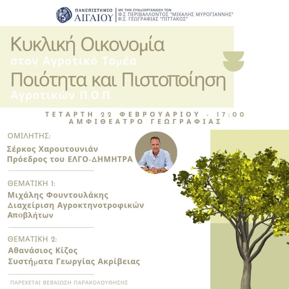 Την Τετάρτη 22 Φεβρουαρίου στις 17:00 στο Αμφιθέατρο του Τμήματος Γεωγραφίας οι Φοιτητικοί Σύλλογοι Περιβάλλοντος « ΜΙΧΑΛΗΣ ΜΥΡΟΓΙΑΝΝΗΣ» και Γεωγραφίας «ΠΙΤΤΑΚΟΣ» συνδιοργανώνουν ακαδημαϊκή ημερίδα με θέμα «Κυκλική Οικονομία στον Αγροτικό Τομέα - Ποιότητα και Πιστοποίηση Αγροτικών Π.Ο.Π.».