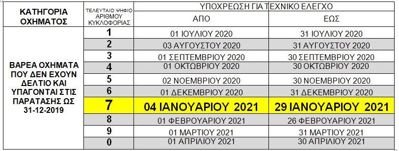 Σύμφωνα με Απόφαση του Αντιπεριφερειάρχη Τουρισμού, Μεταφορών και Επικοινωνιών, προσκαλούνται οι ιδιοκτήτες βαρέων οχημάτων (με ΜΙΚΤΟ ΒΑΡΟΣ άνω των 3500 κιλών) με έδρα την Νήσο Λέσβο που το τελευταίο ψηφίο του αριθμού κυκλοφορίας λήγει σε 7 (ΕΠΤΑ) να προσκομίσουν τα οχήματά τους στο Τμήμα ΚΤΕΟ της Περιφερειακής Ενότητας Λέσβου όπως ορίζεται στον παρακάτω πίνακα:
