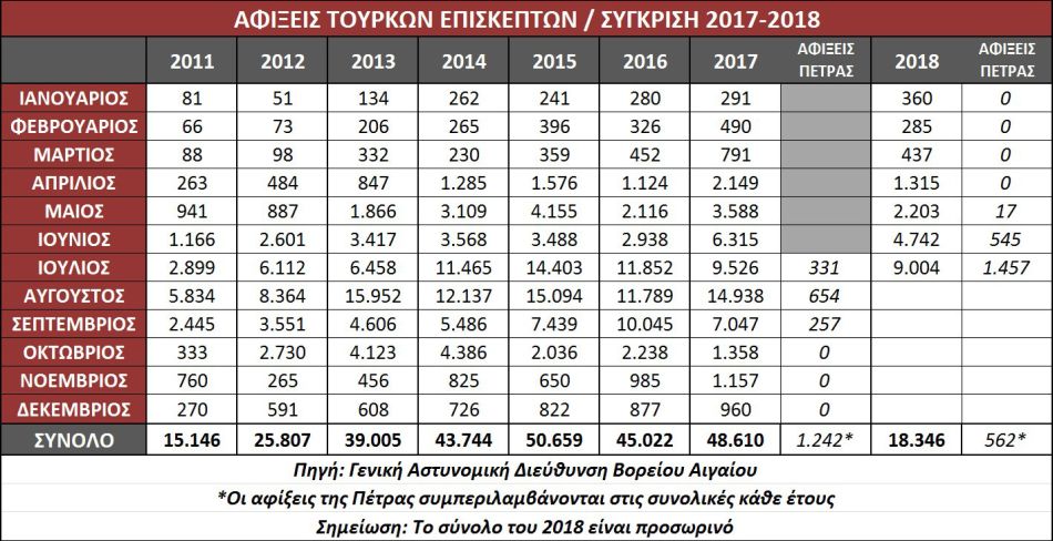 Το ενθαρρυντικό στοιχείο από τα στοιχεία που συλλέγει η Γενική Αστυνομική Διεύθυνση Βορείου Αιγαίου είναι, πως οι προβλέψεις που έκαναν λόγο για αισθητή μείωση σε σχέση με πέρυσι, ακόμα και διψήφιου ποσοστού, δεν επιβεβαιώθηκαν σε απόλυτο βαθμό. Μείωση υπάρχει μεν, όχι στο βαθμό που αναμενόταν δε. Συνολικά, τη Λέσβο επισκέφθηκαν 9.004 Τούρκοι επισκέπτες τον Ιούλιο από τις πύλες της Μυτιλήνης και της Πέτρας, αριθμός οριακά μικρότερος από τους 9.526 επιβάτες τον αντίστοιχο μήνα του 2017. Η σχετική μείωση αγγίζει το 5,48% και αφήνει ένα σημάδι αισιοδοξίας ότι η κατάσταση μπορεί να βελτιωθεί αισθητά τους προσεχείς μήνες, Αύγουστο και Σεπτέμβριο, ειδικά αν αναλογιστεί κανείς πως στο πρώτο εξάμηνο του έτους η πτώση των αφίξεων από τα απέναντι παράλια ξεπερνούσε το 31,4% εν συγκρίσει με τις επιδόσεις του αντίστοιχου χρονικού διαστήματος του 2017!