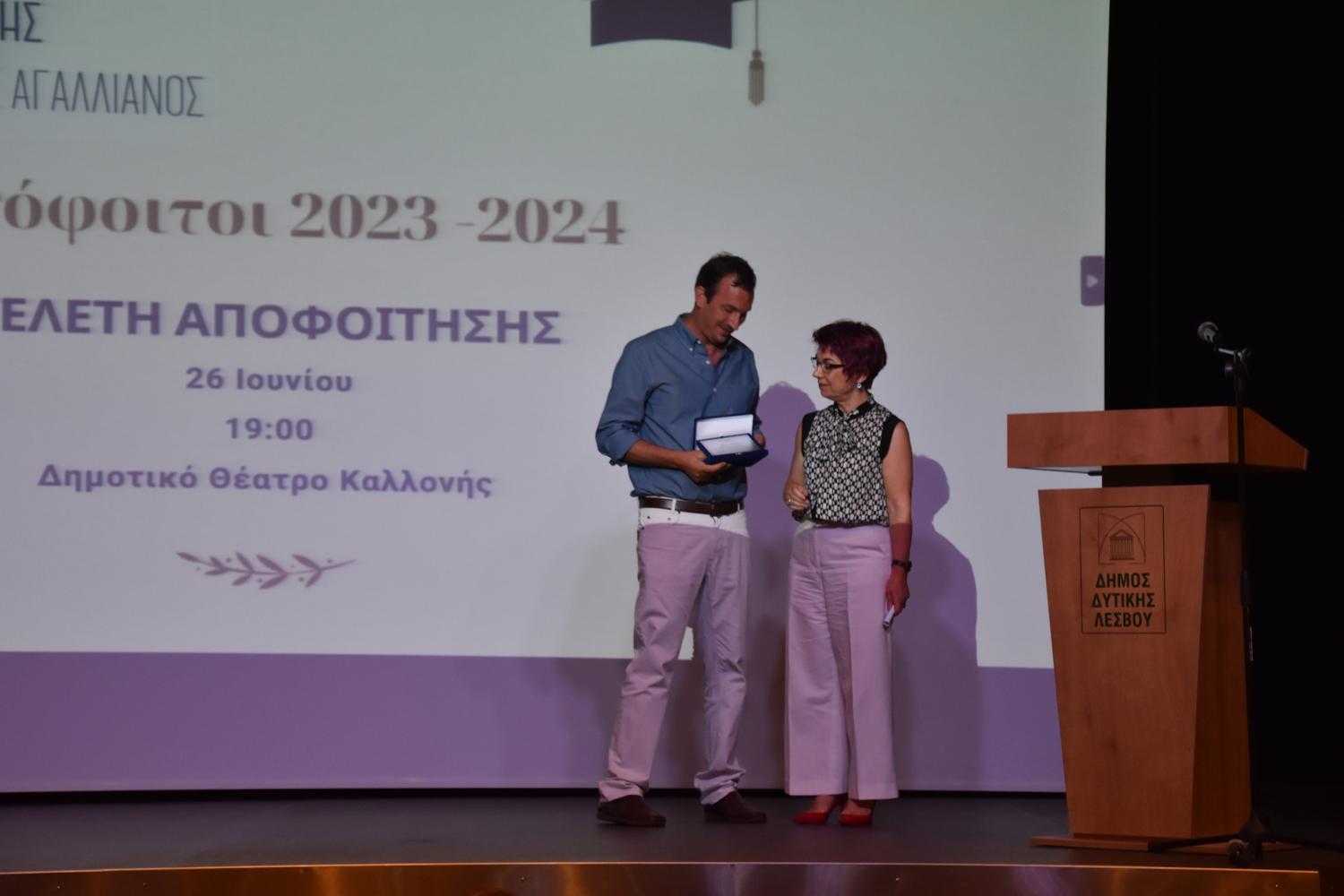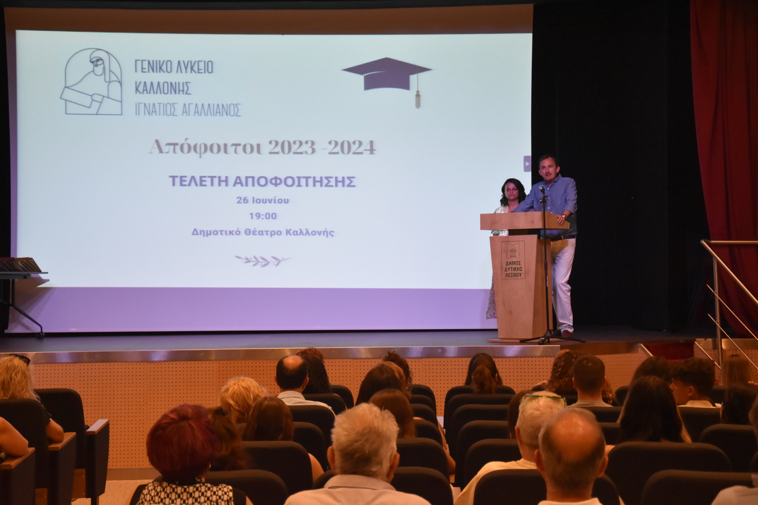 Την Τετάρτη 26 Ιουνίου και ώρα 19:00 στο Δημοτικό θέατρο Καλλονής πραγματοποιήθηκε η τελετή αποφοίτησης των μαθητών και μαθητριών της Γ’ τάξης του Γενικού Λυκείου Καλλονής – Ιγνάτιος Αγαλλιανός, όπου σε κλίμα συγκίνησης απονεμήθηκαν οι τίτλοι Απολυτηρίων τους.
