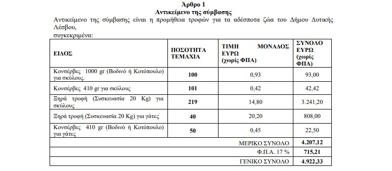Υπεγράφη η σύμβαση προμήθειας τροφών για αδέσποτα ζώα Δήμου Δυτικής Λέσβου, ποσού 4.922,33 ευρώ.