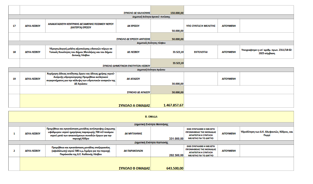 Καμία πρόταση για ταχυδιυληστήρια σε Ερεσό και Βαφειό ενώ μονάδες αφαλάτωσης προτείνονται σε Μυτιλήνη και Παράκοιλα αντί Πέτρας
