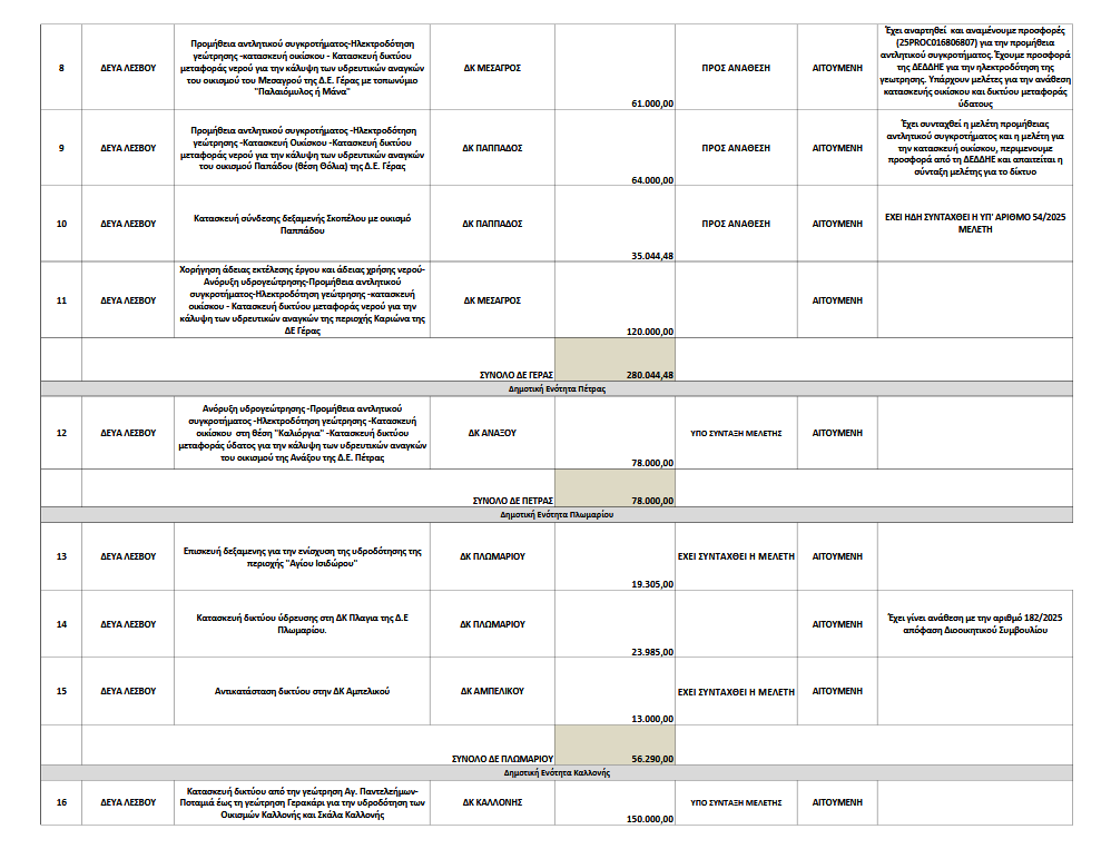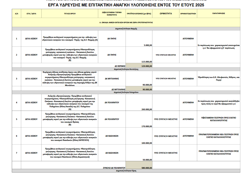 «Σε συνέχεια της από 03-05-2025 σύσκεψης που πραγματοποιήθηκε στα γραφεία της Γενικής Γραμματείας Αιγαίου και Νησιωτικής Πολιτικής, υπό την αιγίδα του Γενικού Γραμματέα κ. Κουτουλάκη, χθες έγινε εκ νέου συνάντηση όπου ο Πρόεδρος της ΔΕΥΑΛ κ. Βάλεσης μαζί με την Διευθύντρια Τεχνικής Υπηρεσίας κ. Σηφάκη και άλλους υπηρεσιακούς παράγοντες, κατέθεσαν τις προτάσεις της Υπηρεσίας, σχετικά με την χρηματοδότηση έργων, για τον Νομό Λέσβου, σχετικά με το θέμα της Λειψυδρίας.