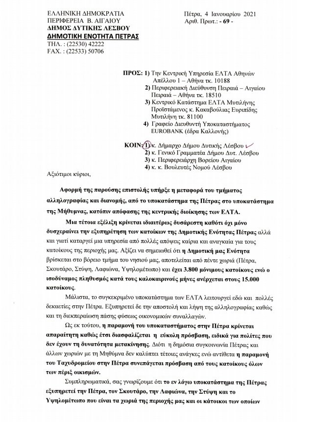 Σε σχετική ανακοίνωση ο Δήμος Δυτικής Λέσβου αναφέρει: «Με αφορμή την πρόθεση μεταφοράς εκ μέρους της κεντρικής διοίκησης των ΕΛΤΑ του τμήματος αλληλογραφίας και διανομής από το υποκατάστημα της Πέτρας στο υποκατάστημα της Μήθυμνας, ο Δήμος Δυτικής Λέσβου παρενέβη σε όλους τους συναρμόδιους φορείς, προκειμένου να αποτραπεί μία τέτοια εξέλιξη.