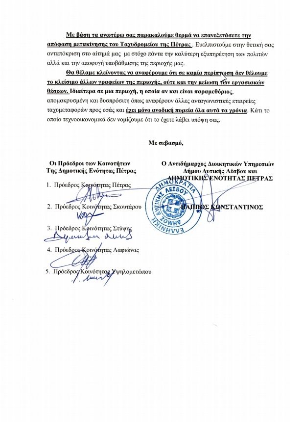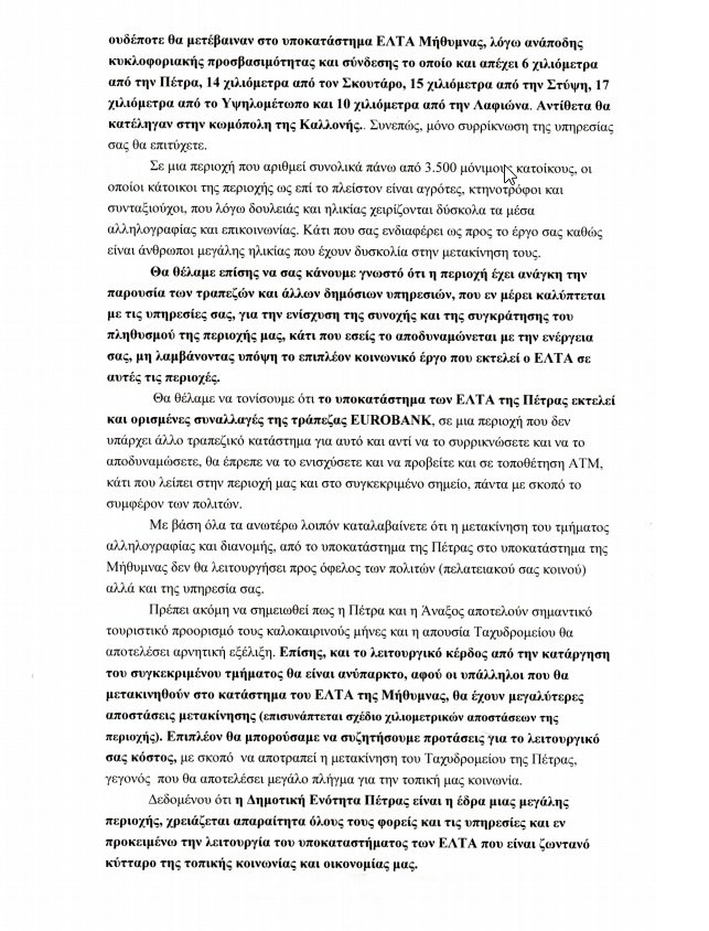 Στη σχετική επιστολή ο Αντιδήμαρχος Διοικητικών Υπηρεσιών Δυτικής Λέσβου και Δημοτικής Ενότητας Πέτρας, Κωνσταντίνος Πάππος, παρακαλεί τη Διοίκηση των ΕΛ.ΤΑ. να επανεξετάσει την απόφαση μετακίνησης του Ταχυδρομείου της Πέτρας στο υποκατάστημα της Μήθυμνας, ευελπιστώντας ο πρώτος, στην θετική ανταπόκριση της Διοίκησης των ΕΛ.ΤΑ, στο υποβληθέν αίτημα που στόχο έχει την καλύτερη εξυπηρέτηση τω πολιτών και την αποφυγή υποβάθμισης της περιοχής. «Θα θέλαμε κλείνοντας να αναφέρουμε ότι σε καμία περίπτωση δεν θέλουμε το κλείσιμο των γραφείων της περιοχής, ούτε και την μείωση των εργασιακών θέσεων. Ιδιαίτερα σε μια περιοχή, η οποία αν και είναι παραμεθόριος, απομακρυσμένη και δυσπρόσιτη όπως αναφέρουν άλλες ανταγωνιστικές εταιρείες ταχυμεταφορών προς εσάς και έχει μόνο ανοδική πορεία όλα αυτά τα χρόνια. Κάτι το οποίο τεχνοοικονομικά δεν νομίζουμε ότι το έχετε λάβει υπόψη σας» αναφέρει στο κλείσιμό της η επιστολή.