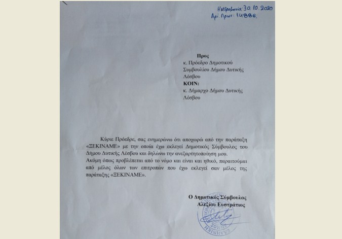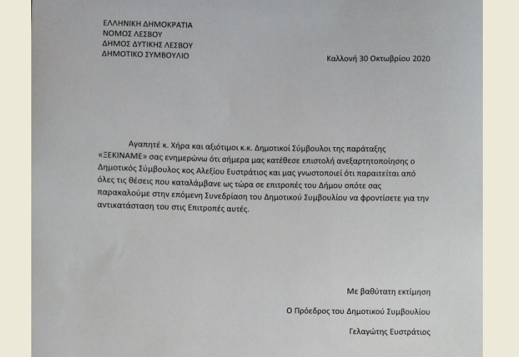 Ο κ. Γελαγώτης, όπως υποστηρίζεται στο δελτίο Τύπου, του Δήμου Δυτικής Λέσβου ενημέρωσε ακολούθως με έγγραφο τον επικεφαλής της παράταξης «Ξεκινάμε» για την εξέλιξη ζητώντας του να γίνουν αντικαταστάσεις στις επιτροπές που είχε τοποθετηθεί ο κ. Αλεξίου. «Αγαπητέ κ. Χήρα και αξιότιμοι κ.κ. Δημοτικοί Σύμβουλοι της παράταξης «Ξεκινάμε» σας ενημερώνω ότι σήμερα μας κατέθεσε επιστολή ανεξαρτητοποίησης ο Δημοτικός Σύμβουλος κος Αλεξίου Ευστράτιος και μας γνωστοποιεί ότι παραιτείται από όλες τις θέσεις που καταλάμβανε ως τώρα σε επιτροπές του Δήμου οπότε σας παρακαλούμε στην επόμενη Συνεδρίαση του Δημοτικού Συμβουλίου να φροντίσετε για την αντικατάστασή του στις επιτροπές αυτές».